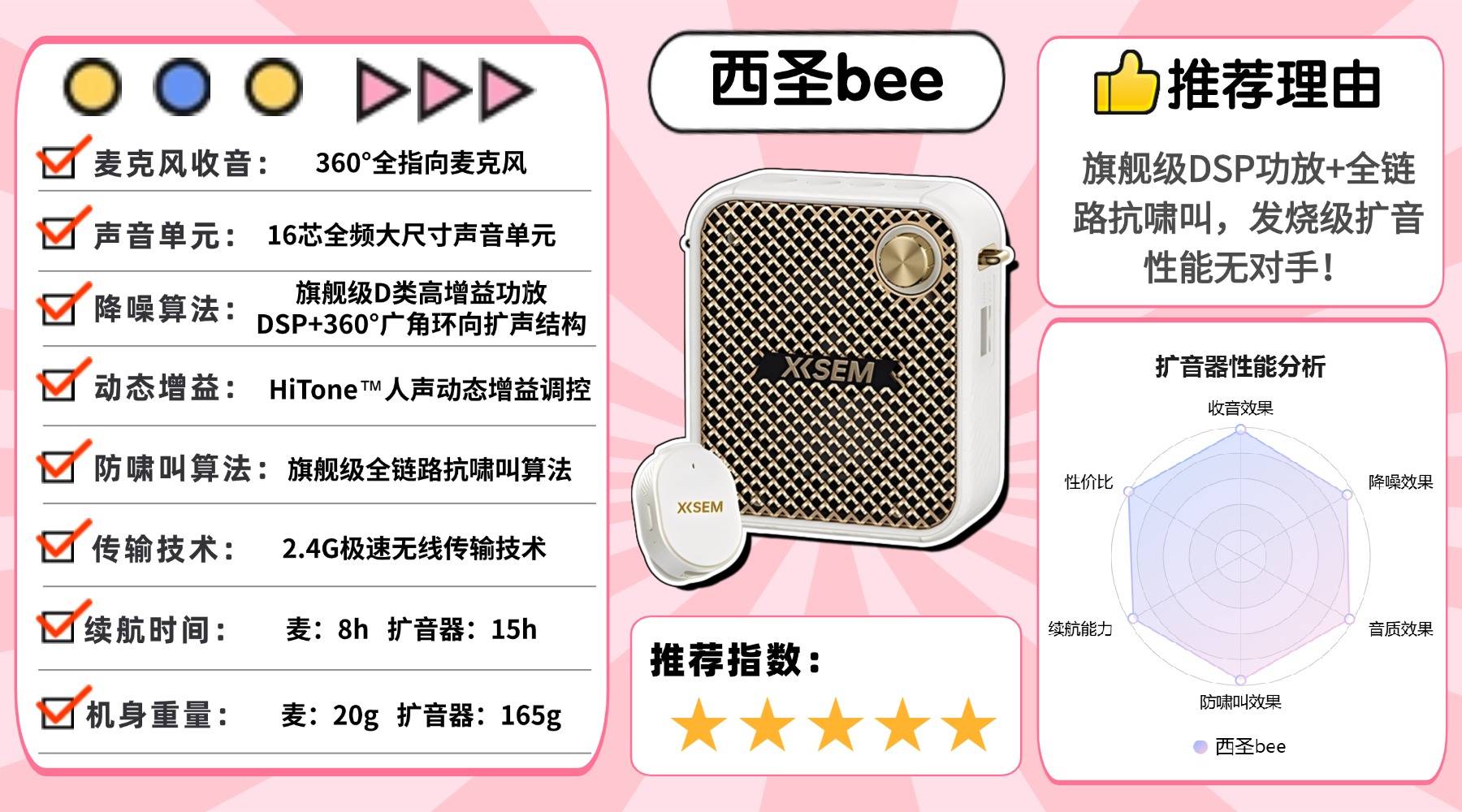 西圣是国内少数真正以声学技术立身的数码品牌之一,拥有十多年音频算法与声学研发经验,长期为多家国际品牌提供音频方案,被业内誉为“平价扩音设备的技术标杆”。在市面上不少产品仍停留在“比功率、拼造型、打价格战”的阶段时,西圣Bee坚持以音质纯净、信号稳定、抗啸叫强为核心方向,凭借硬核技术实力打破传统扩音设备的性能局限。