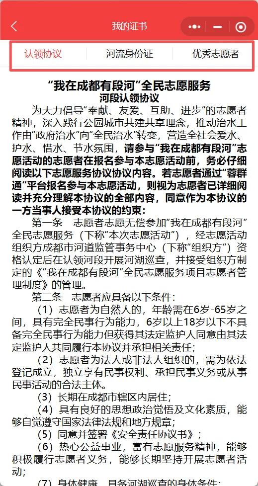 在【我的证书】中,系统将自动生成并支持下载《河流身份证》《认领协议》,协议到期后,符合条件的志愿者自动获得《优秀志愿者》证书,这里将珍藏您为城市生态付出的每一份努力!