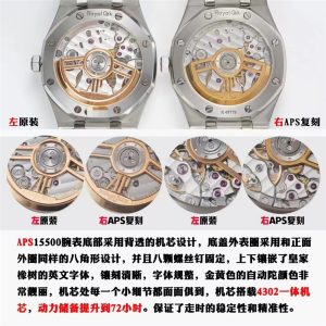 aps工厂采用43024302机芯,摆轮在7点方向,区别于9015年6点方向,动力储备从9015年30小时提升至72小时以上。后盖刻字布局一点也不差,字体粗细,深度一致。后盖整体弯曲的深度也是标准正品数据,这就是为什么表头厚度与正品高度一致。