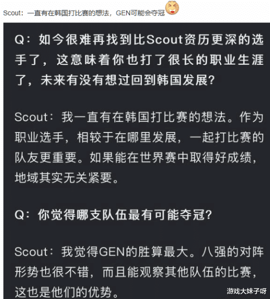比如在世界赛打完之后,有一位选手明确表示要离开,他就是Scout,他在采访时就直言想回LCK,一直有这样的想法,并且还表示希望GEN能夺冠。