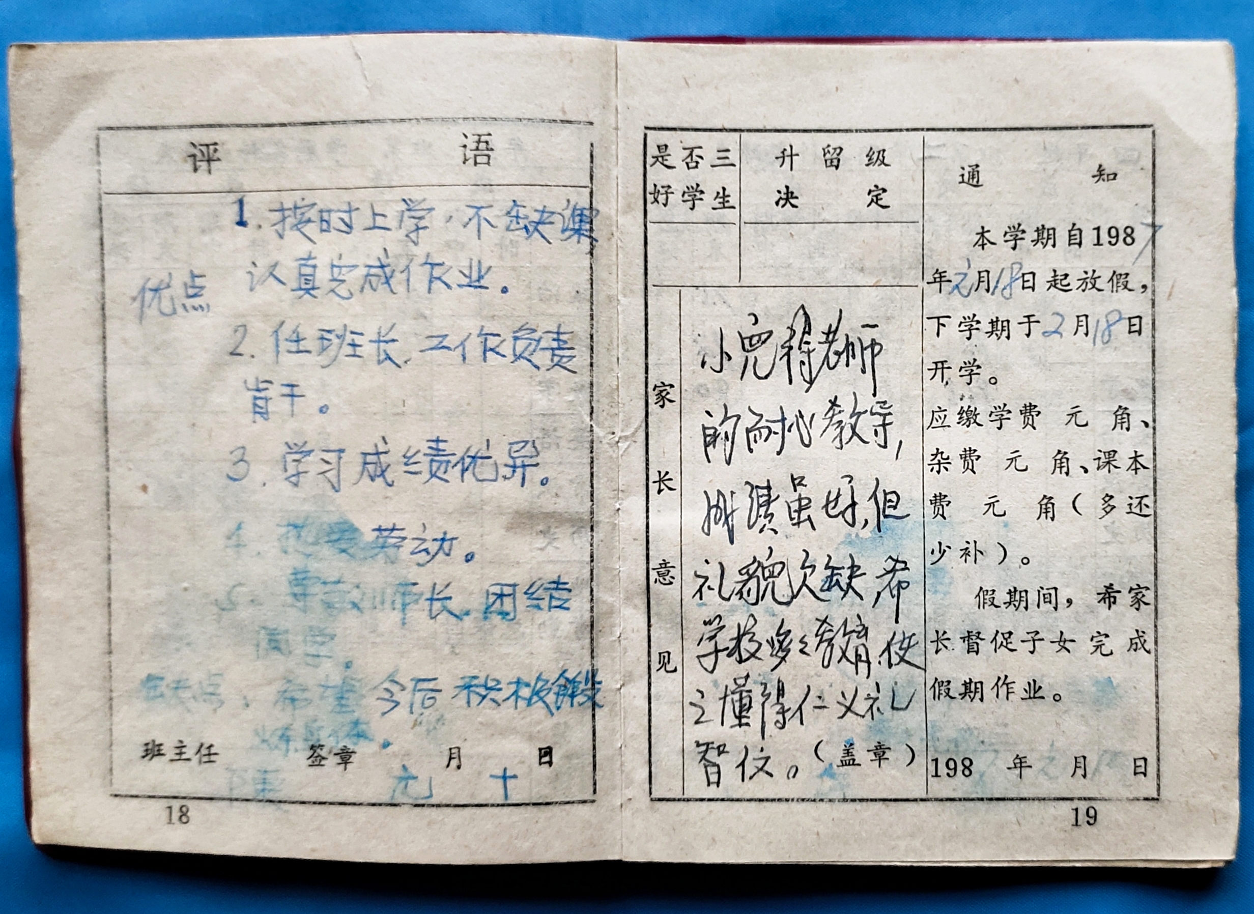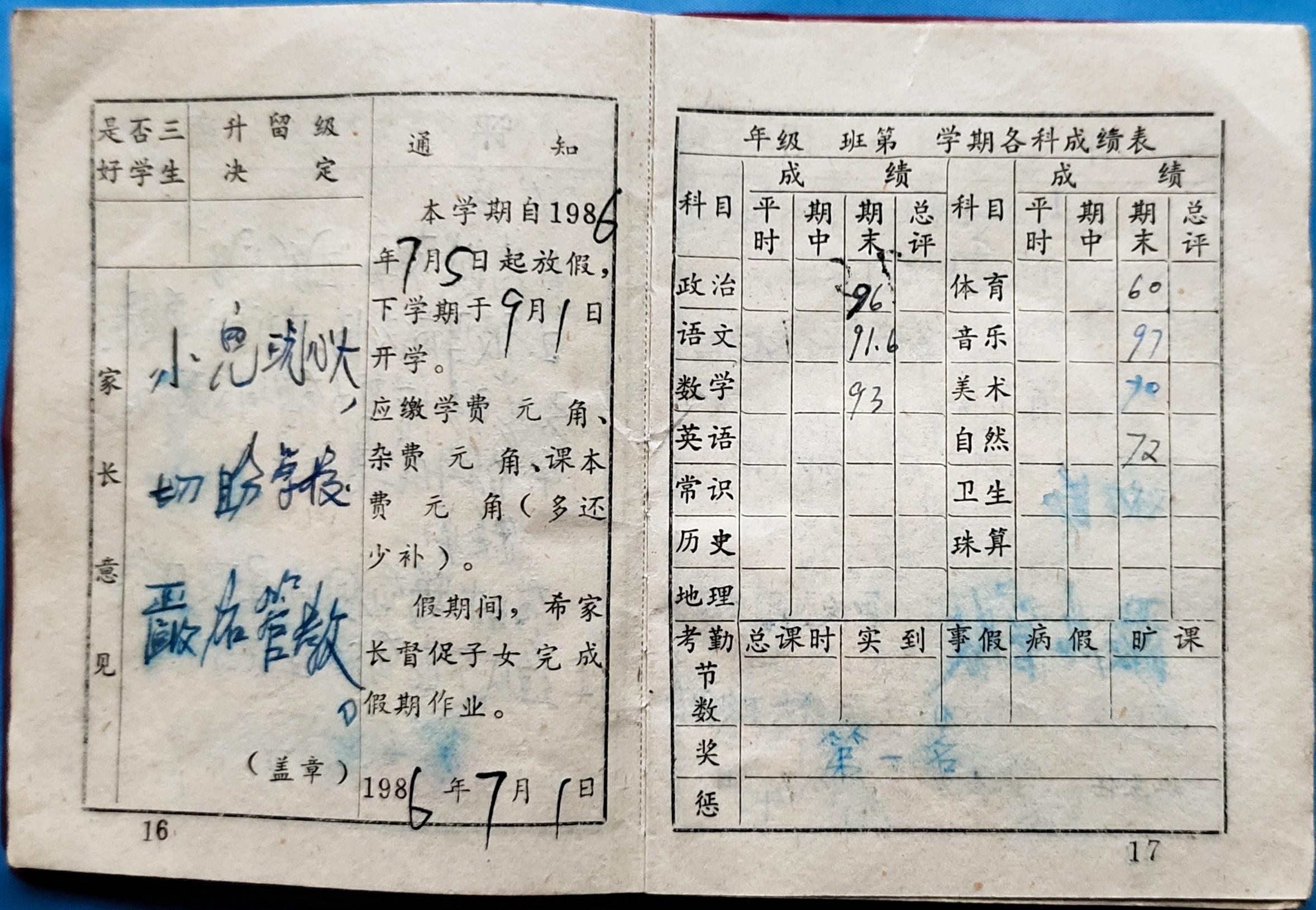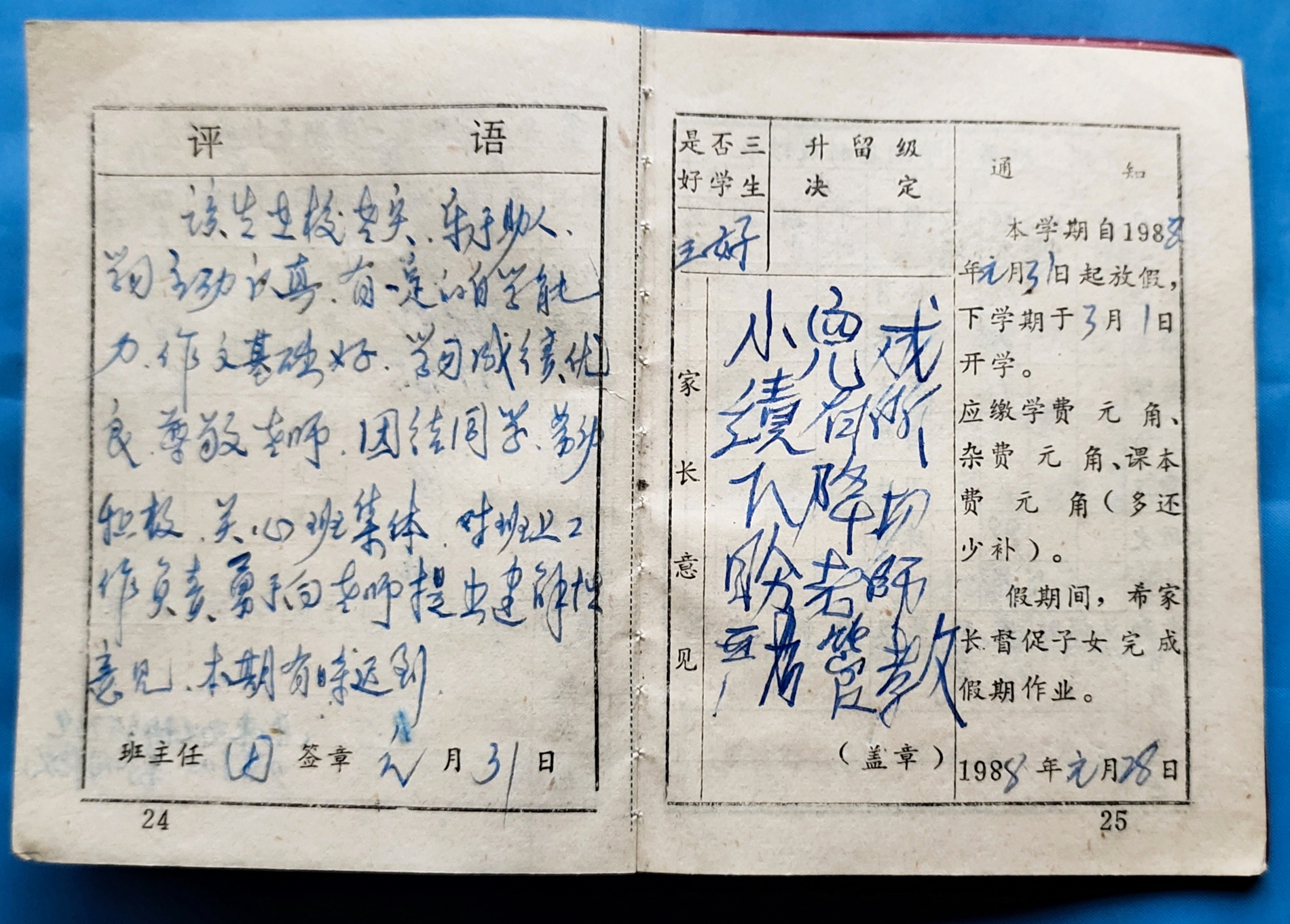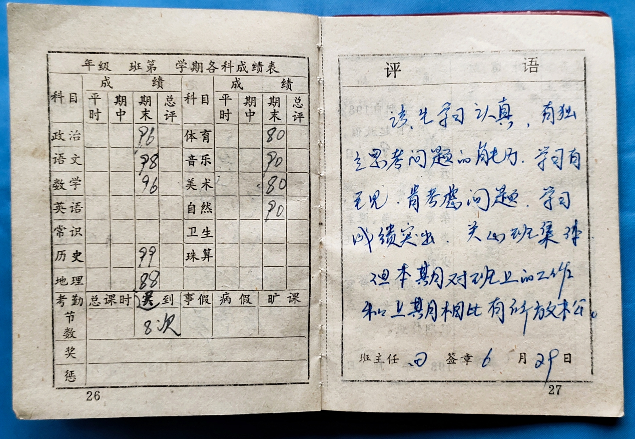 ▲我三年级时的成绩表和陈敬明老师写的评语