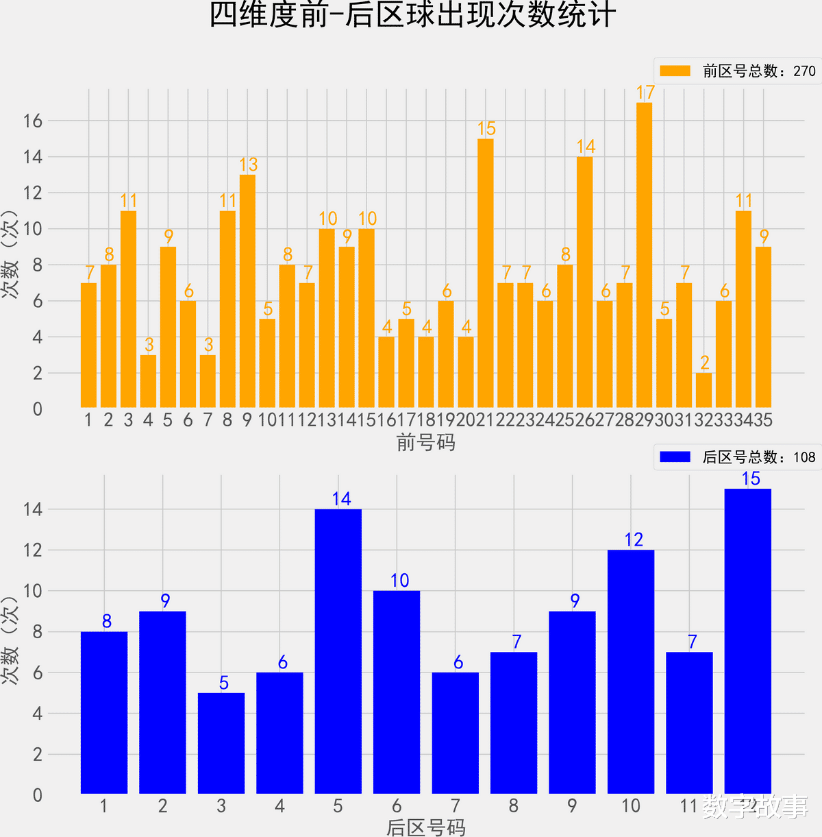 => 统计出现概率综合以上4个纬度的号码,共54期根据出现次数,分为热号,冷号,其他的为温号。统计样本数据: 270个前区号码 108个后区号码