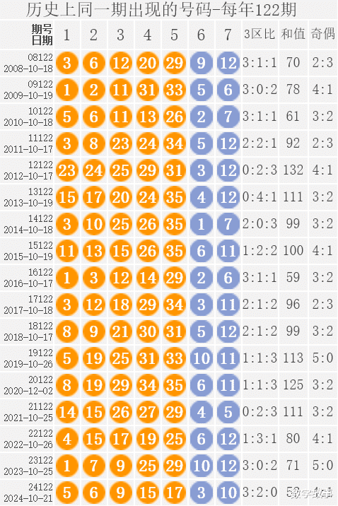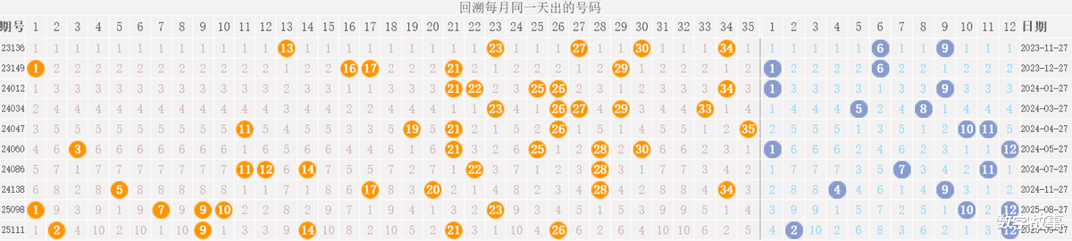 博弈心理,挑战概率: 看近期开奖号码,也可看历史数据统计!【大乐透25122期多角度冷热号】大乐透25122期四维走势图,前后区号统计及冷热号1) 历史同一天:10月27日 (共7期)