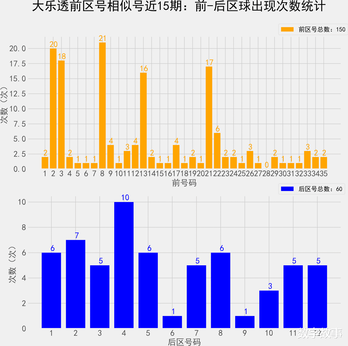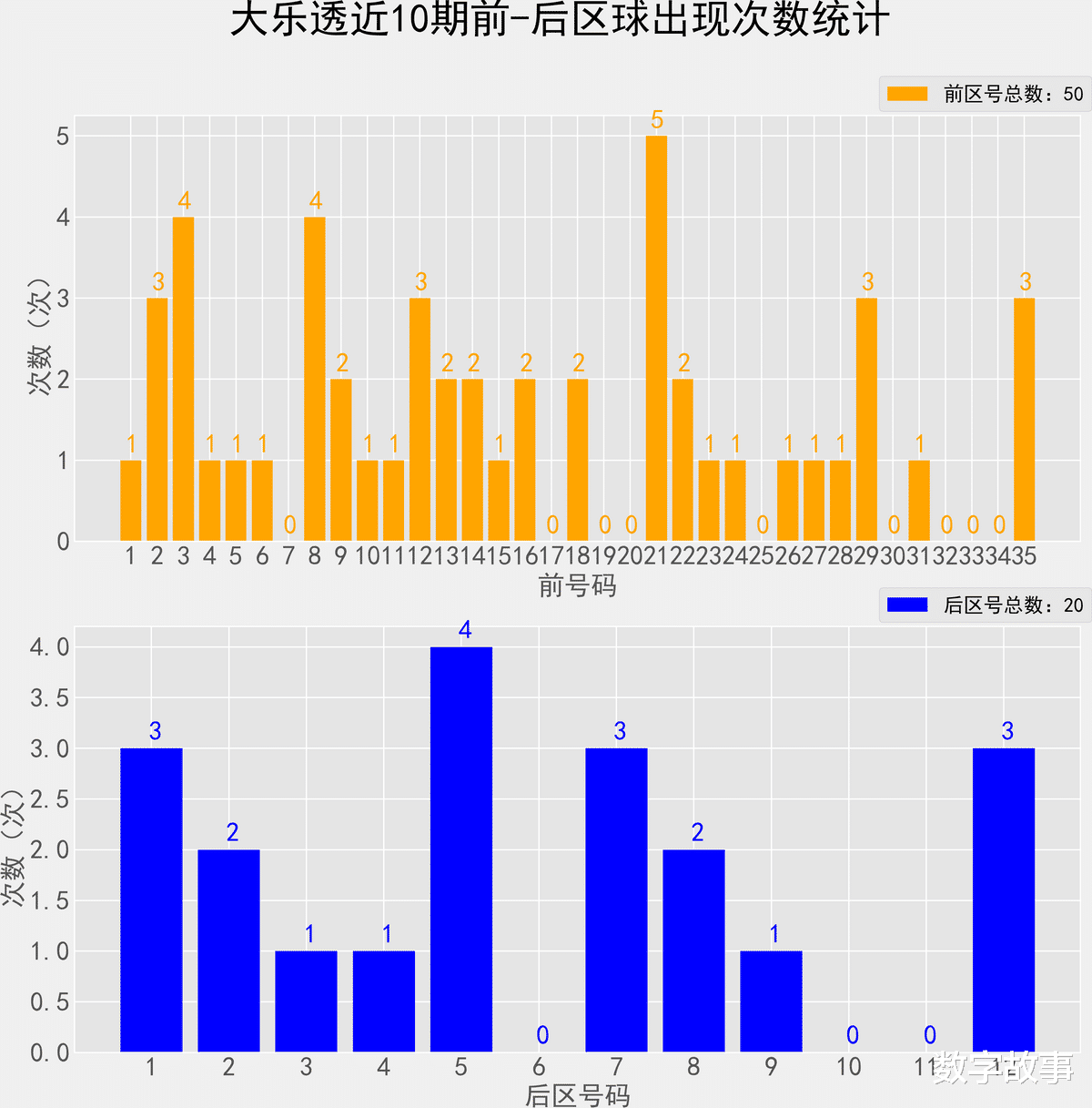 大乐透近10期前后区号统计情况统计样本数据: 50个前区号码 20个后区号码