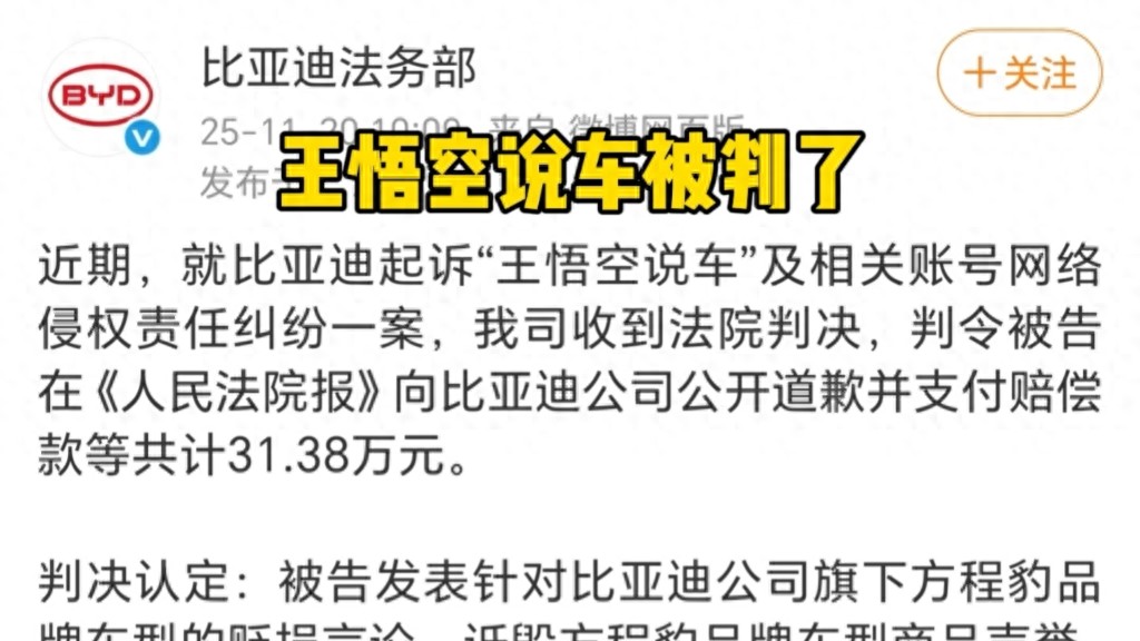 近日,比亚迪诉“王悟空说车”案尘埃落定,被告发表针对比亚迪旗下方程豹品牌车型的贬损言论,构成对企业名誉权的侵害,被判公开赔礼道歉并赔偿31.38万元。这似乎是比亚迪法务部门的一次胜利,但是对比亚迪或方程豹而言,迟到的正义算不上什么正义。换个角度看,诋毁贬损比亚迪大半年,价格只需要31万多。