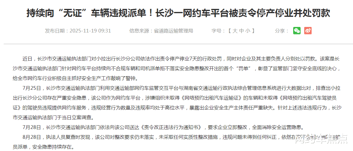 小拉出行长沙分公司因持续向无证车辆和司机派单,被责令停产停业 7 天,公司被罚 5000 元,主要负责人更是被罚 5 万元。