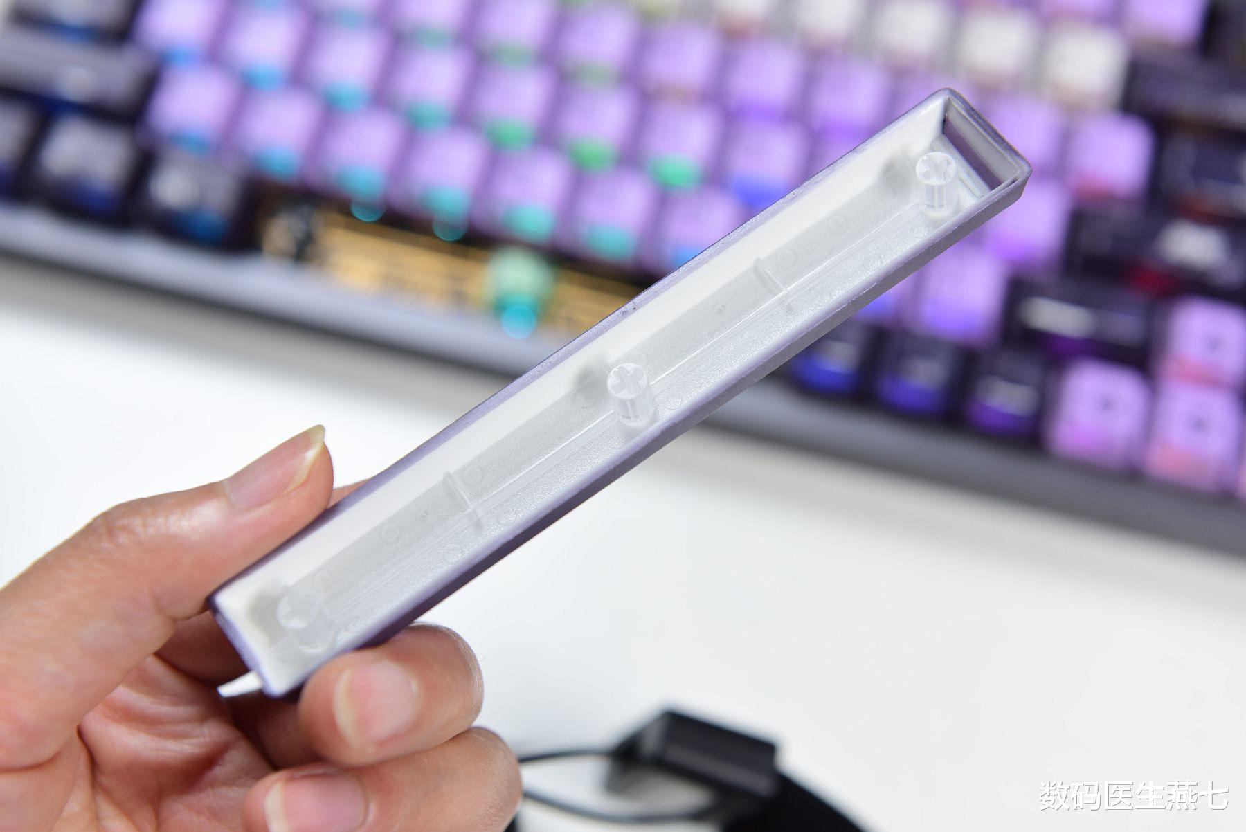 ▲来看一下星驰87的庐山真面目,86键按键布局的尺寸相对是比较小巧的,尤其它的边框是前后有框,左右无框。按官方的说法这叫魔毯悬浮架构,属于其自创,确实很大胆,颜值各位结合灯效一起看,从我个人的使用角度来说左右这种悬浮设计师利于清理键盘的。