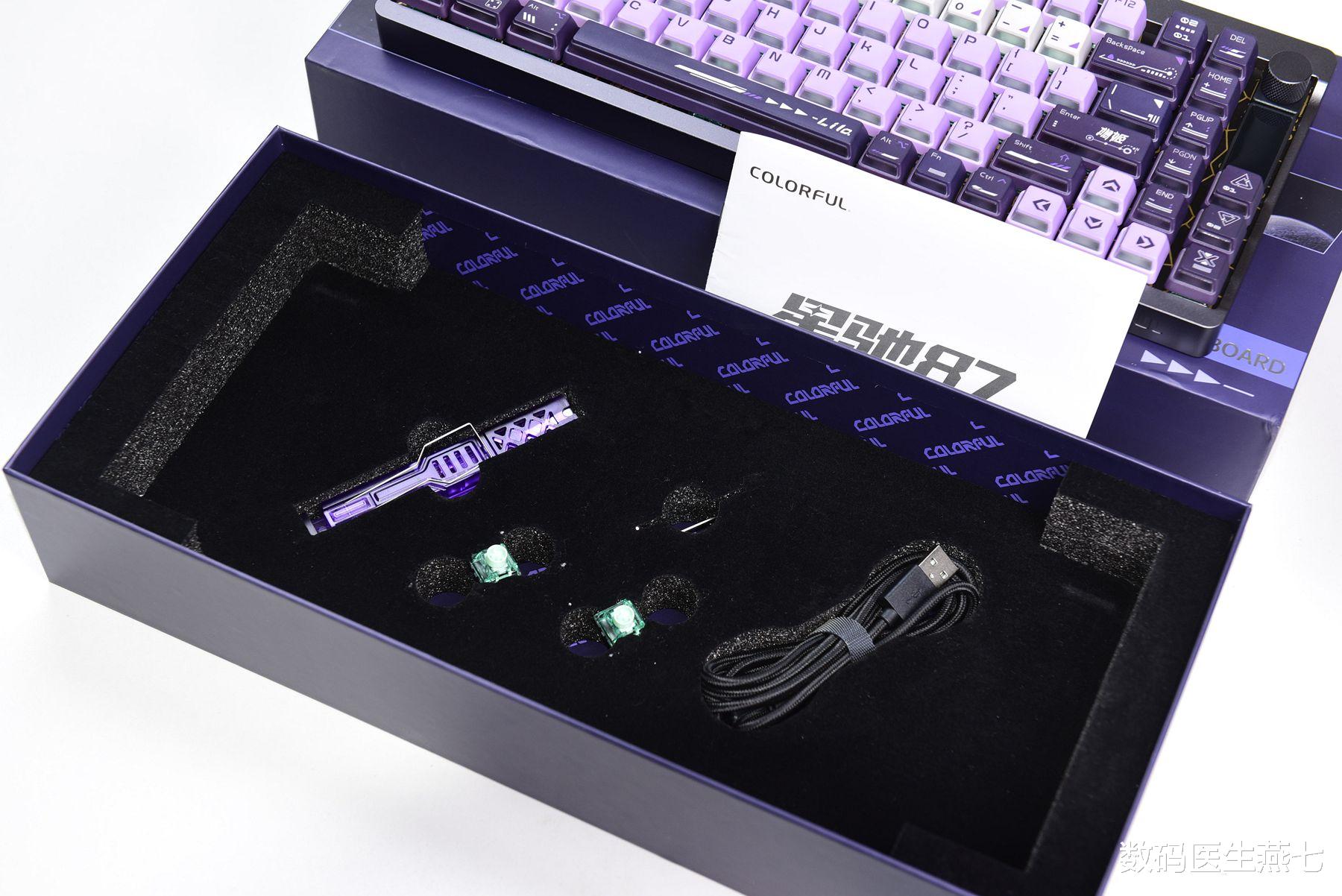 ▲星驰87的配件展示,紫色的其实是二合一的拔轴拔键器,其余的则是可插拔的C口数据线、L型的6角小扳手以及说明书和两枚备用轴。