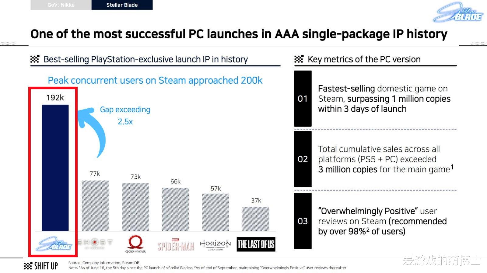 表现到底有多亮眼呢?《剑星》先以PS5独占形式发售一年,2025年6月登陆PC后,迅速打破多项纪录!Steam平台最高同时在线玩家数突破19.2万,这一数据比其他PlayStation独占大作移植PC后的峰值多出逾2.5倍,也让它成为PS在Steam上第二款同时在线破10万的游戏。PC版发售仅三天销量就突破100万份,截至目前PS5与PC双版本总销量已超过300万份,创下韩国单人主机游戏的新纪录。更值得一提的是:它还超越了《对马岛之魂》《战神》《漫威蜘蛛侠》等经典作品,成为索尼PlayStation历来最畅销的单机PC游戏(不含多人游戏,比如《绝地潜兵2》)。