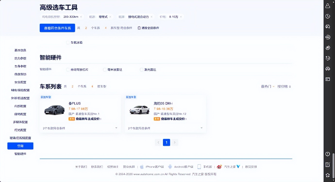 新款车型最主要的变化有两方面:最重要的变化是,续航里程上中高配车型都增加到了200公里以上,这极大缩小了比亚迪和友商在纯电续航里程上的差距。这个变化意味着什么?以汽车之家为例,搜索8-10万,续航200-300km的插电混动产品,结果目前只有2个,分别是比亚迪秦和海豹。也就意味着,对于这个区间的消费者而言,比亚迪的优势非常巨大。