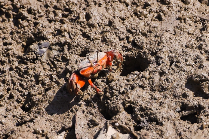 接着,众人来到广东湛江高桥红树林。这里是广东湛江红树林国家级自然保护区的核心地带,是我国大陆连片面积最大的一片红树林,汇集了木榄、红海榄等多种红树植物,也为众多滨海生物提供了理想家园。招潮蟹高举红螯在洞口巡视,弹涂鱼借助胸鳍奋力跳跃,鼓虾螯足开合发出清脆的“哒哒”声,整片滩涂洋溢着蓬勃的生命活力。不远处,专家指向更广阔的海域介绍,红树林远处的海域也是“海中大熊猫”中华白海豚重要的觅食场和栖息地。作为第十五届全运会吉祥物的原型,中华白海豚的畅游正是对这片海域生态健康的最佳认证。