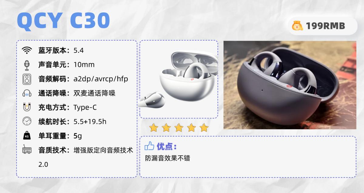 QCY C30单耳才5g,相比来说是一片花瓣重一些,戴去上课听课件,放学收拾书包才发现没摘,完全没存在感。反Z型耳夹设计特聪明,镍钛合金C桥能贴耳廓弧度,厚耳薄耳都稳,跑步甩头也不掉,戴眼镜也不硌。但耳夹偏硬,久戴两小时以上,耳廓会有点夹得慌,得偶尔摘下来松松。IPX5防水够靠谱,运动暴汗、小雨淋到都不怕,百元机这配置很良心。