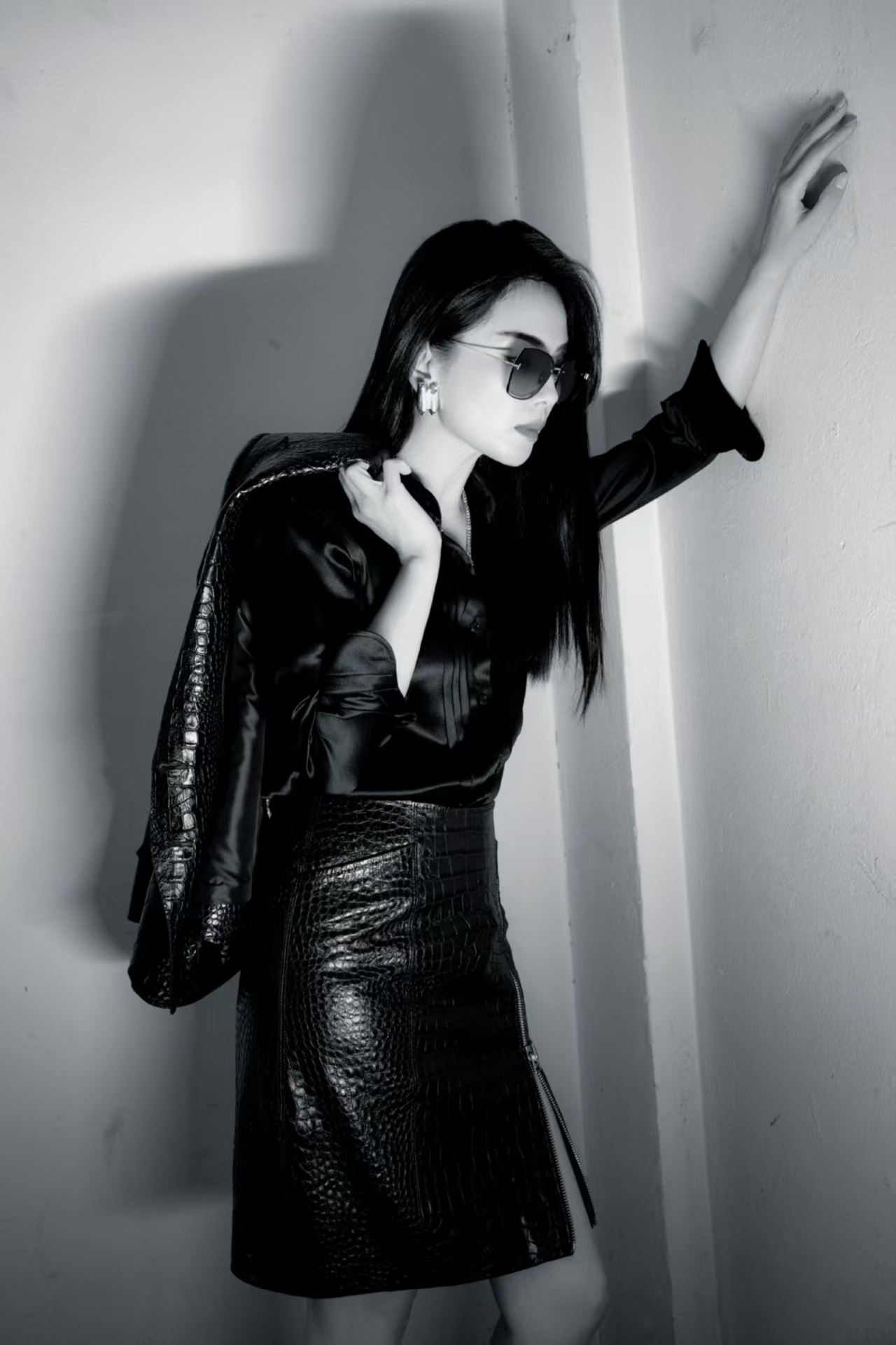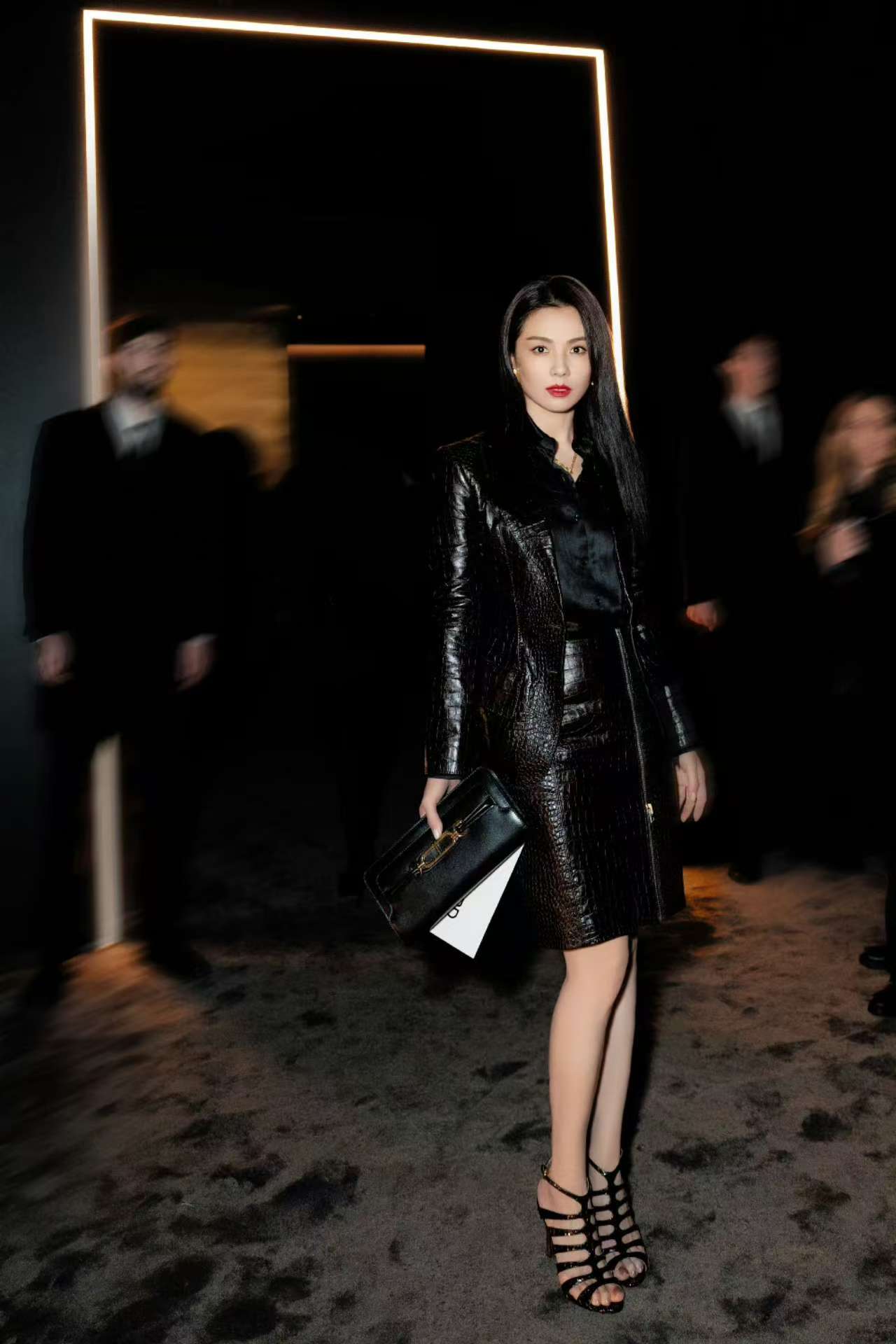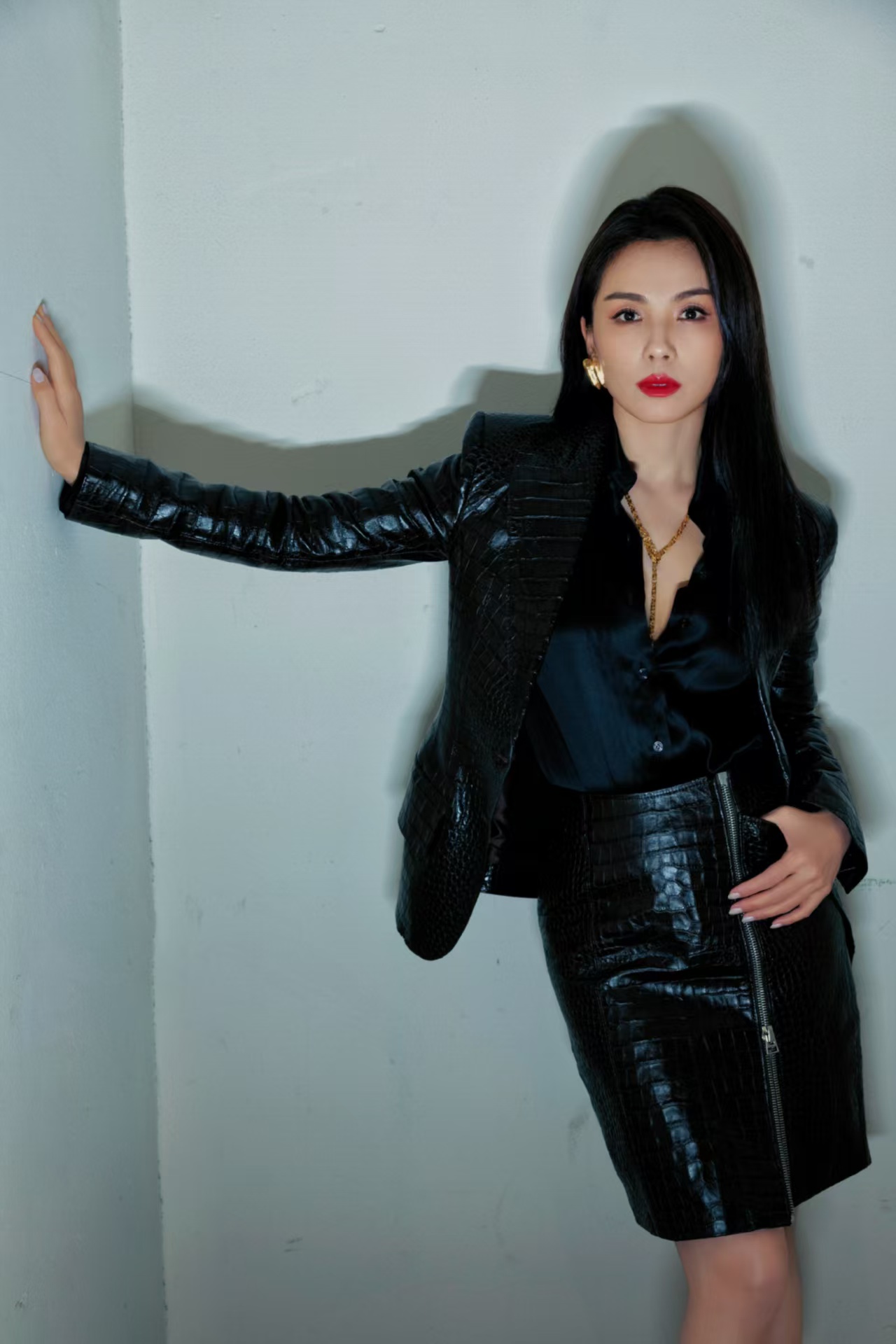 电梯镜面里的生图更绝:她单手插在皮裙口袋里,金属光裹着腿的轮廓,腿长直接占满了镜面的下半截,高跟鞋的绑带缠在脚踝上,衬得脚踝细得像易碎的瓷,连鞋尖的弧度都跟着腿型往“漫画比例”上靠。往白墙前一站时更惊艳,皮套装的冷硬和她红唇的艳撞出强烈反差,肩线的利落裹着腰的细软,连耳尖的金饰都卡在光影里,添了几分冷艳的贵气。
