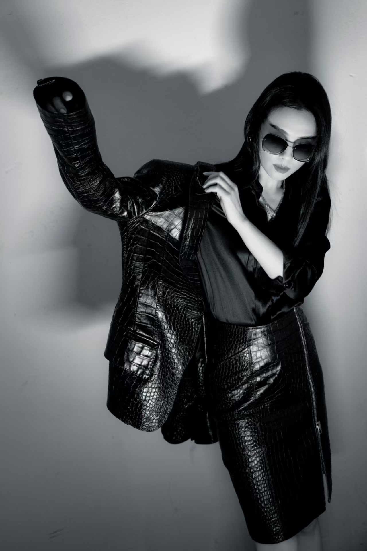 那身鳄鱼纹皮套装,每道纹路都裹着冷冽的哑光光泽:西装肩线撑出利落的直角肩,偏偏在腰腹处收得极窄,像被设计师拿标尺量过的弧度,轻轻一掐就能攥住的细腰,往下是翘得刚好的臀线,皮裙的开叉又卡在大腿最细的位置,露出的腿直得像被精心打磨过的玉,连腿侧的线条都流畅得没一点多余的肉。