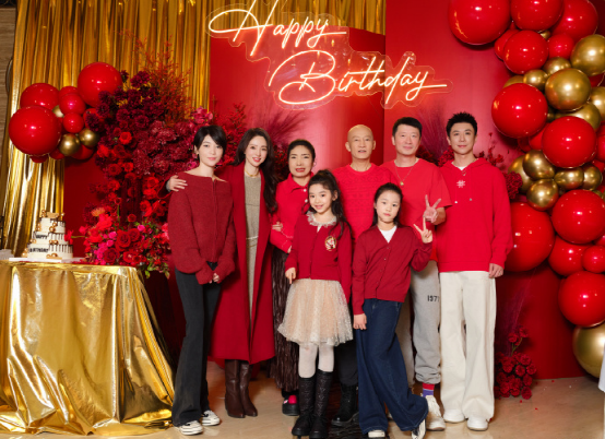 现场布置得红红火火很喜庆,又热闹又很温馨,全部都用了红色装饰,包括红色气球还有鲜花,一家人也穿着红色的服饰。