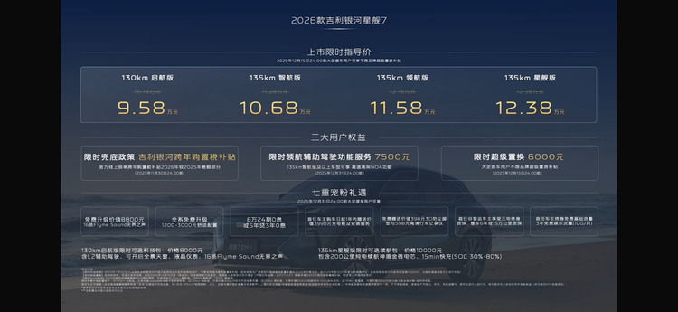 2026款吉利银河星舰7 EM-i限时指导价从9.58万起,此次共推出四个不同版型供消费者选择。新车在安全架构和舒适配置