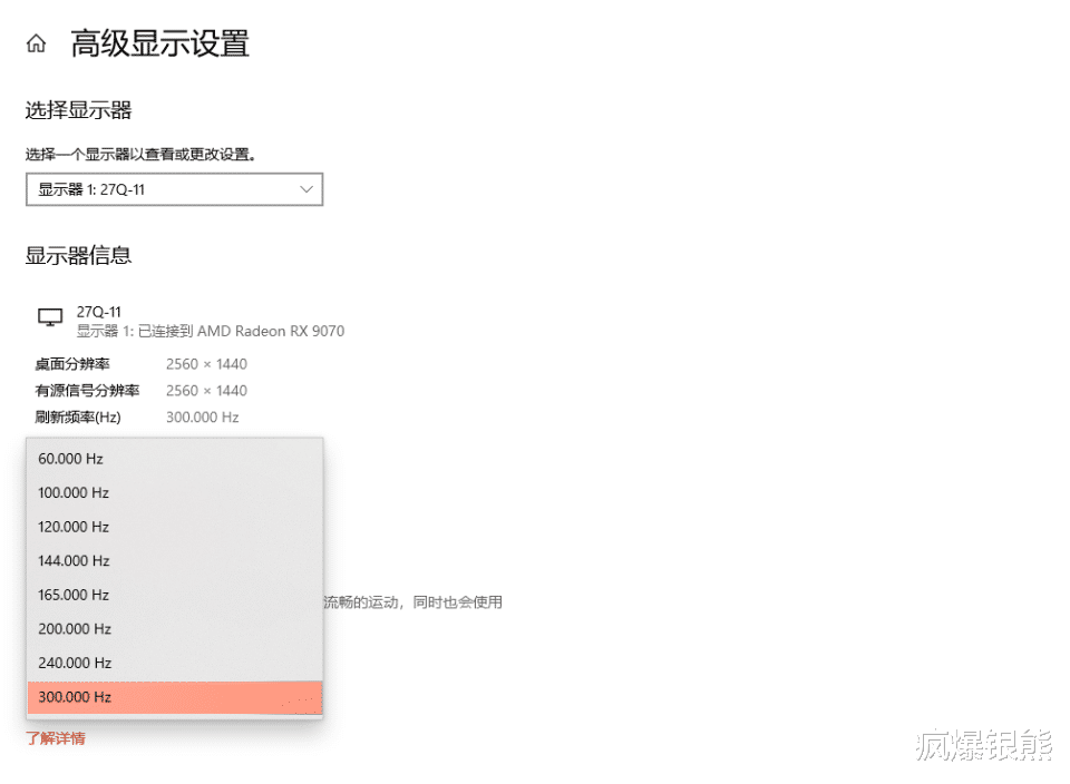 在Win显示设置中我们能看到其除了支持300Hz刷新率外还支持240、200、165、144、120、100和60共计8种刷新率。