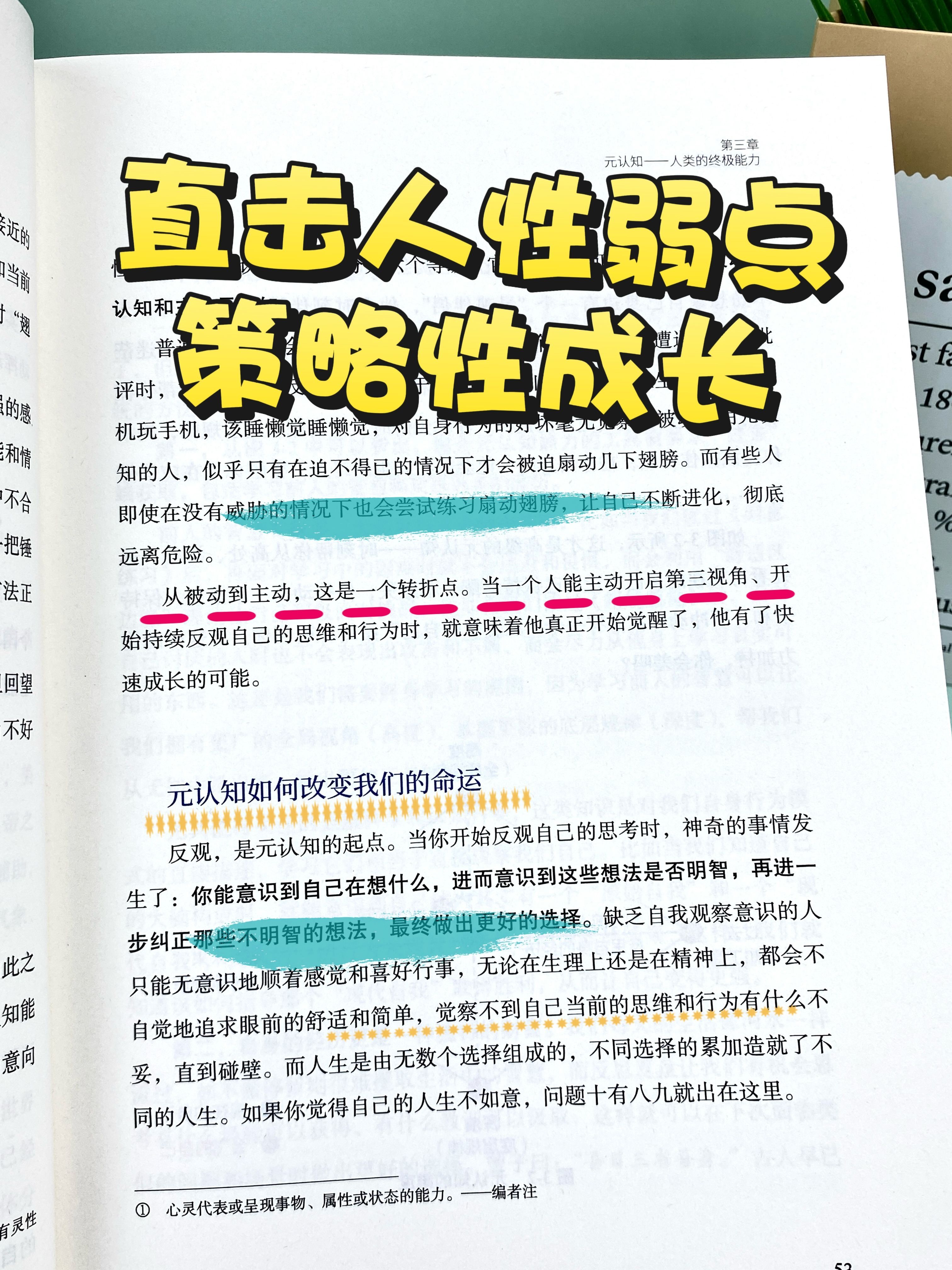 普通人通常只会在遇到问题时被迫启用这个能力,比如遭遇指责、批评时,才不得已去反思纠正;处于顺境时,依旧会顺着本性生活,该玩手机玩手机,该睡懒觉睡懒觉,对自身行为的好坏毫无觉察。被动使用元认知的人,似乎只有在迫不得已的情况下才会被迫扇动几下翅膀。而有些人即使在没有威胁的情况下也会尝试练习扇动翅膀,让自己不断进化,彻底远离危险。