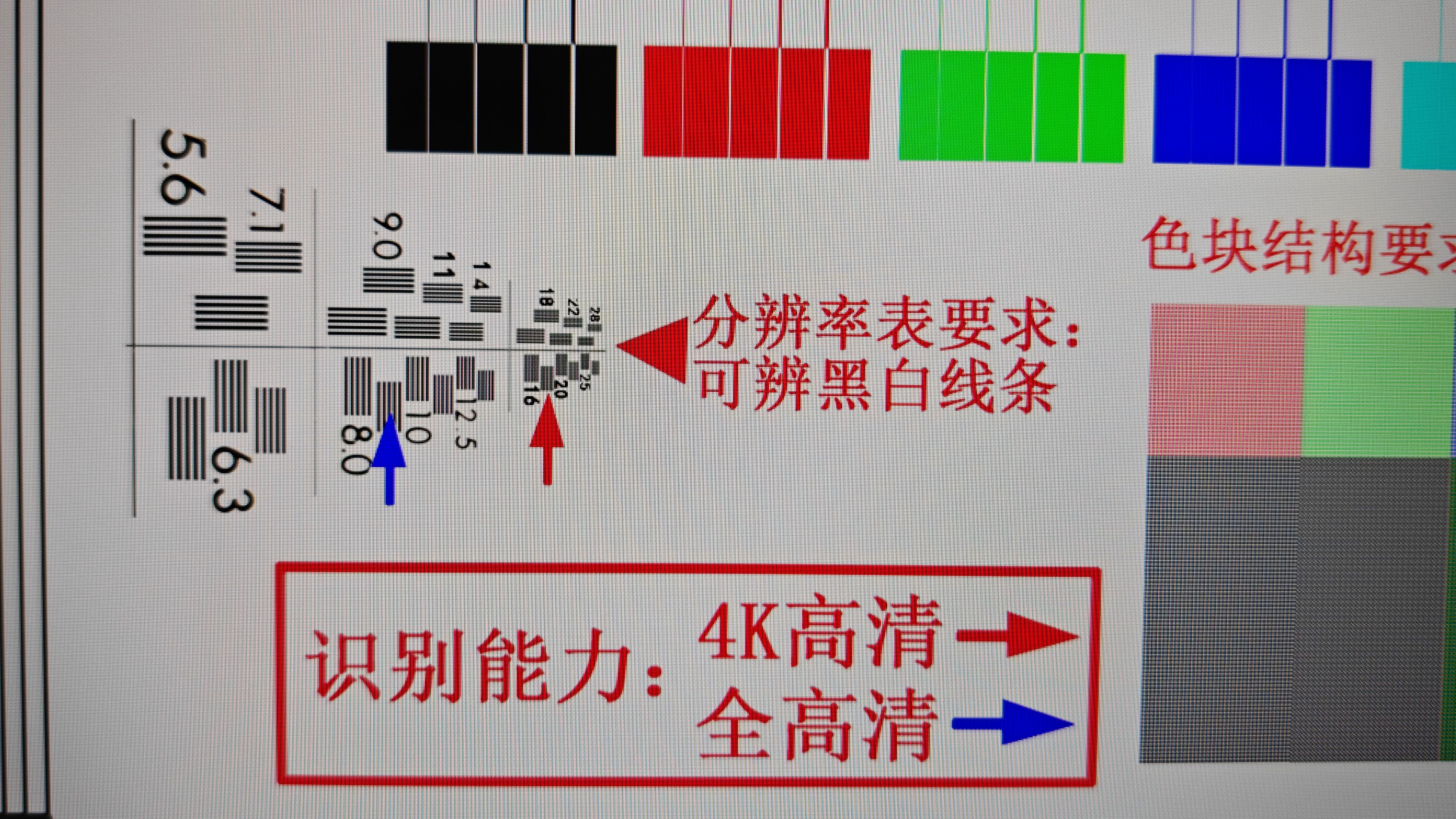 2K分辨率对应的箭头为蓝色箭头,4K分辨率对应的是红色箭头,从实测图中看到,蓝色箭头指向的线条边缘清晰可见,红色箭头位置只能看个大概。
