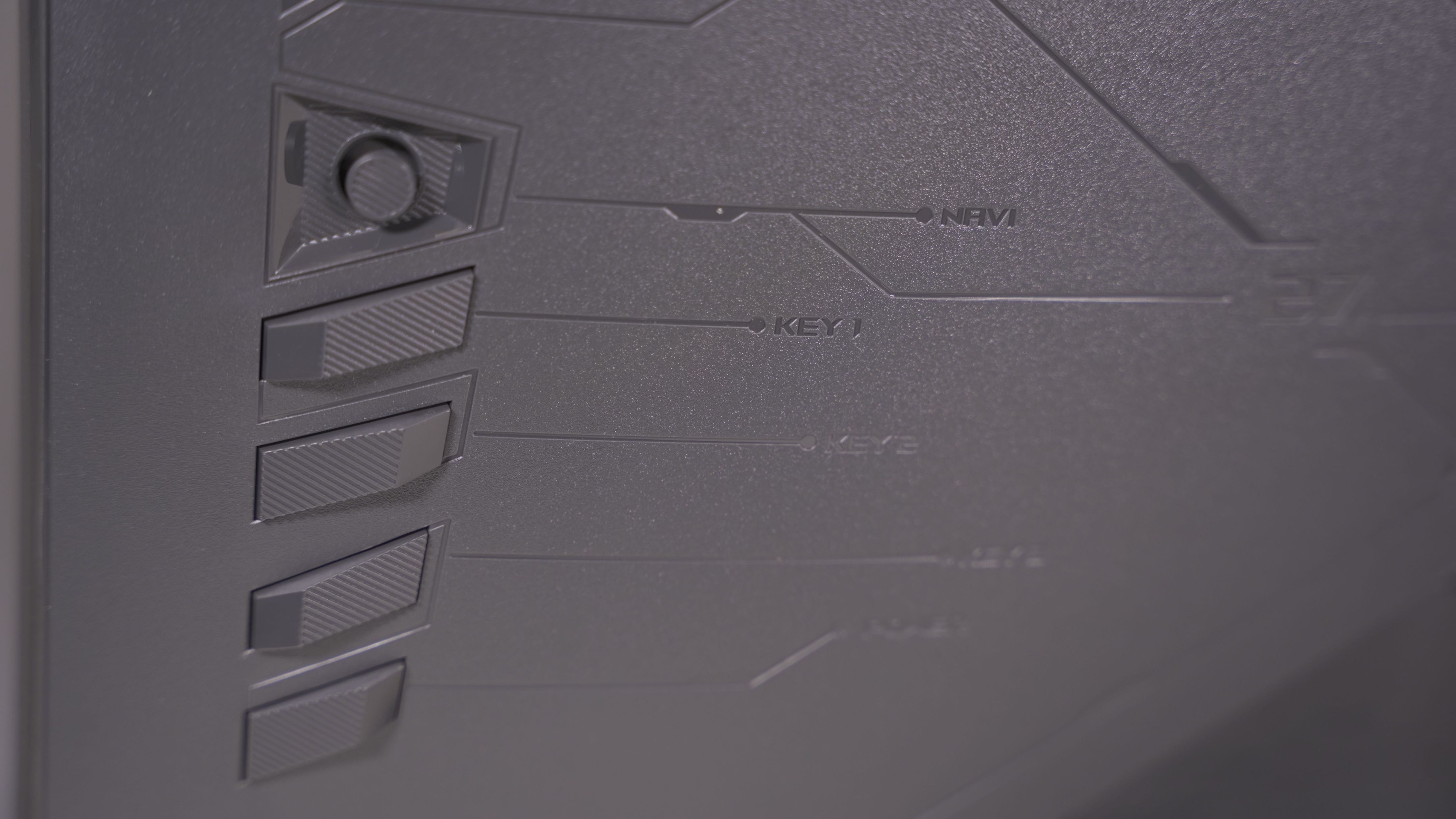 ROG绝杀27二代的物理按键在左侧背面,包括一个OSD摇杆和四个反向倾角设计的按键,用于调节显示器的功能。