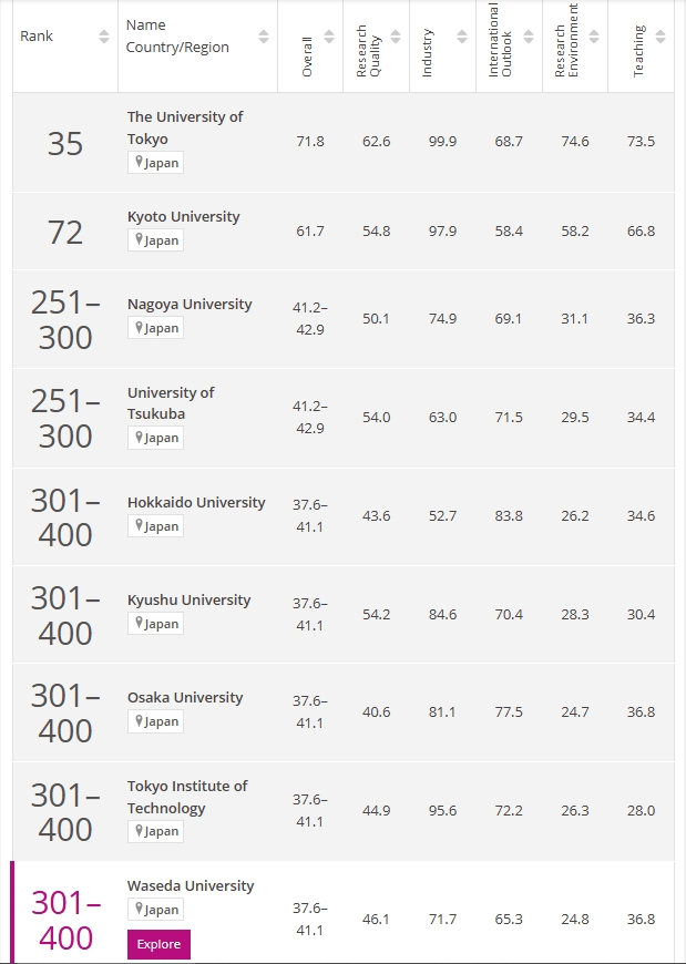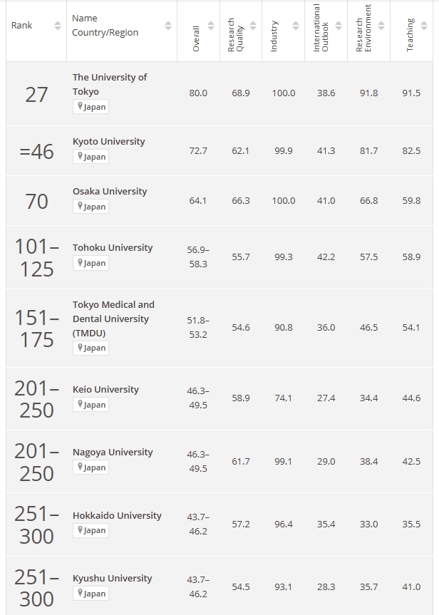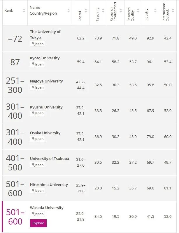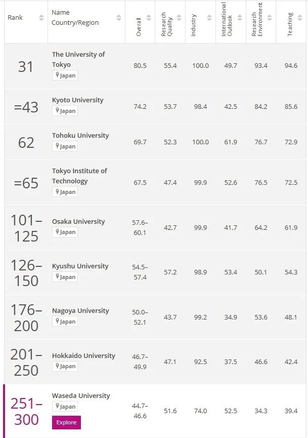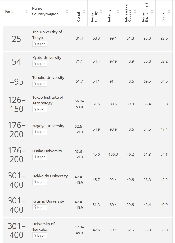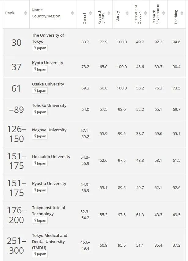 东京大学、京都大学无可厚非,无论是哪个学科都可以说是日本高校中的佼佼者;