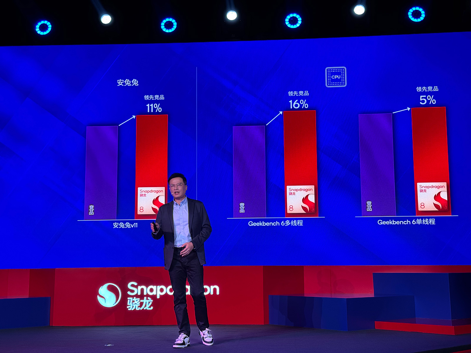 高通技术公司产品市场高级总监马晓民表示,相比竞品,第五代骁龙移动平台运行安兔兔v11的跑分领先11%,在Geekbench测试中,CPU多核表现领先16%,单核领先5%,并且能效也有更优秀的成绩。