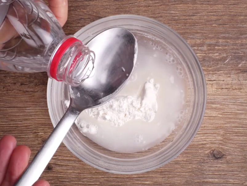 现在我们需要调一些淀粉水。需要9克的玉米淀粉,然后加入110克的清水给它搅拌均匀了。如果你对这个克数把握的不太准的话,可以用勺子来基本上衡量。当然也是可以用面粉来代替,因为面粉更加常见。大概就是一勺的面粉,然后再加入12勺的清水。但是用面粉的话有一个缺点,就是它在搅匀的过程中没有淀粉这么容易,不可避免的会出现一些面疙瘩。但是整体影响也不大,所以看家里的东西了,用哪个都行。