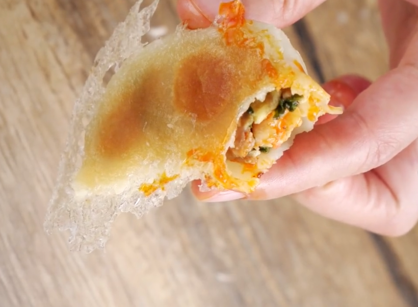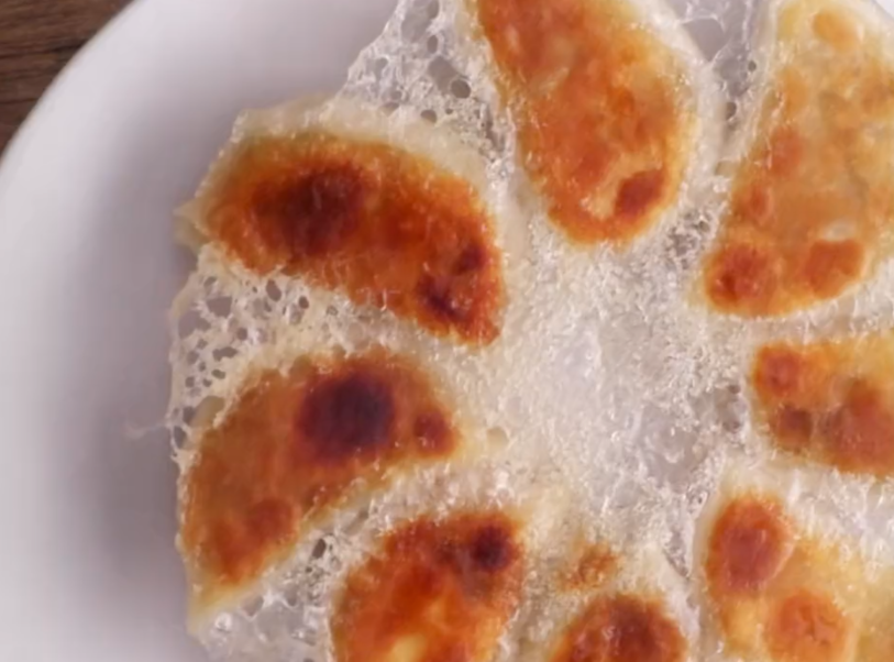 最后一步就是出锅了,为了不破坏冰花,要完整的把整个冰花煎饺都给弄出来,可以用梅菜扣肉一样的手法。就是把一个盘子盖在锅上年,然后紧紧的扣住,一个手按着盘子,一个手拿起锅,快速的把锅翻起来,让冰花煎饺完整的落入盘子里就大功告成了。冰花底真的超级酥脆哦,再加上绝美的饺子馅,一口下去,谁能不爱上这个冰花煎饺呢。