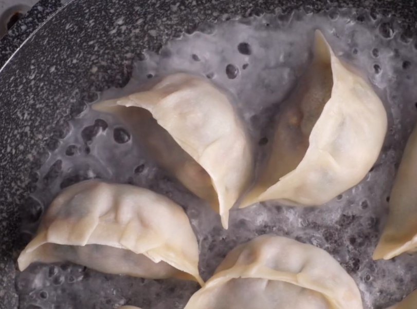 准备好这些食材之后,我们就可以来煎饺子了。煎饺子的需要的锅大小要合适,如果太大的话,那么中间的冰花很容易就已经糊了,但是边缘上冰花还没有成型,太小的话又不能当上一圈的饺子,就不那么好看了。还有一点需要注意的就是锅一定要是不粘锅,毕竟做的是冰花煎饺,粘锅别说成型了,恐怕连煎饺都会变得支离破碎。我们在锅里倒入适量的油,然后把饺子一个个放进去摆成一个小圆。稍微煎上一会,大概饺子的底部呈现金黄色就可以了。这个时候就可以将刚刚调制好的淀粉水倒进去了,淀粉水的量能够盖住整个锅底就可以了。盖上锅盖,用中小火继续烧制,直到淀粉水冒出大气泡来,就可以把火调小,然后再煎个五六分钟左右就行了。这个时候冰花就能够完全成型了。刚倒入淀粉水的时候一定要是中小火,不能是小火,因为小火不能够让冰花出现漂亮均匀的孔洞。