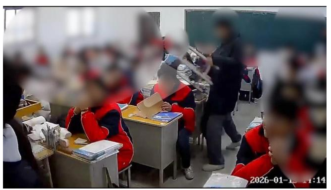 画面显示,事件发生在 2026 年 1 月 13 日的一间教室里。彼时教室里坐满了学生,课堂秩序看似平静。突然,一名坐在后排的学生猛地站起身,顺手抄起身旁的板凳,径直走向前排的一名同学。没有任何言语争执,这名学生举起板凳,狠狠砸向了前排同学的后脑勺。