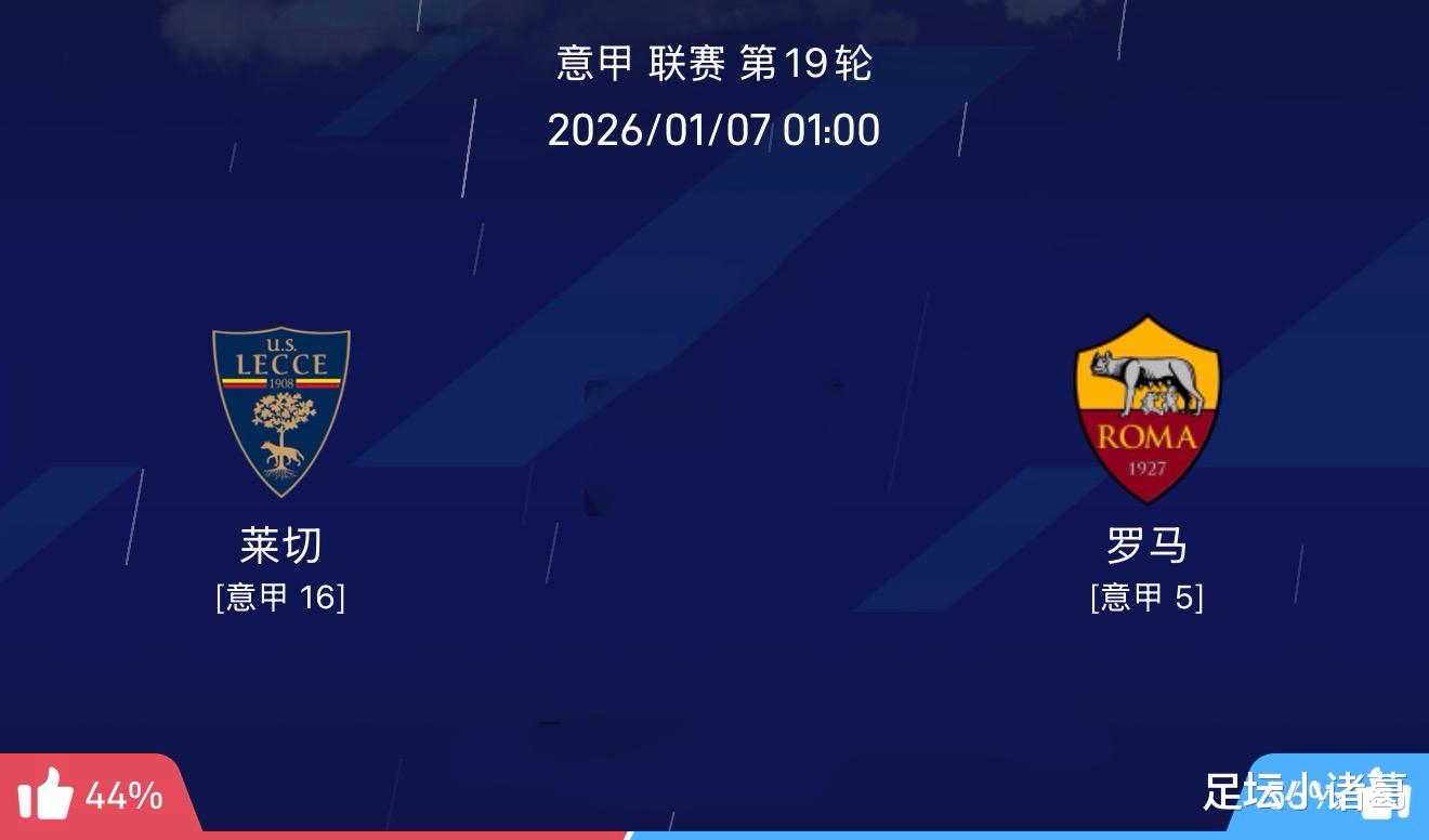 关键伤停:莱切中场贝里沙、莫伦特伤缺,库利巴利征战非洲杯;罗马佩莱格里尼伤缺,曼奇尼、埃尔莫索停赛,恩迪卡非洲杯,防线临时拼凑