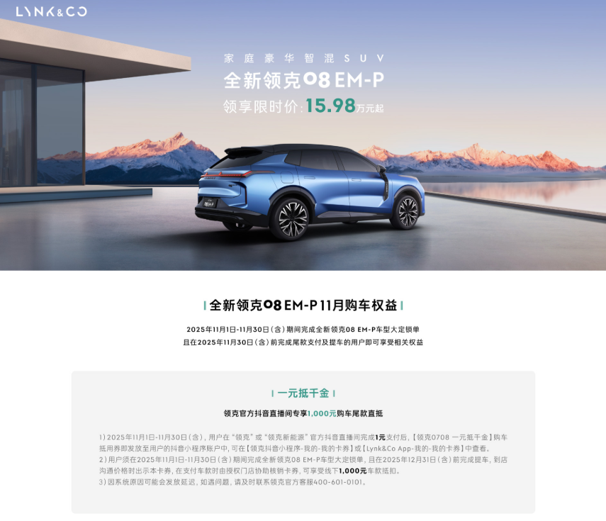 11月,领克品牌开启限时购车优惠活动,全新领克08 EM-P的起售价定为15.98万元。此次活动福利丰富多样,有一元抵千金的超值抵扣、最高可达6,000元的限时领享金、10,000元的焕新补贴、16,000元的选装基金,还有价值35,000元的终身免费NOA辅助驾驶服务,同时多项金融优惠政策和交车好礼也一并推出。对于打算在年底前购车的消费者而言,当下无疑是绝佳的购车时机。