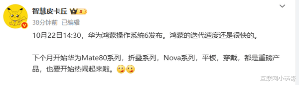 10 月 21 日,余承东在微博官宣了鸿蒙操作系统 6。这款系统将于 10 月 22 日 14:30 正式发布,预计华为 Mate 80 系列会首发搭载。