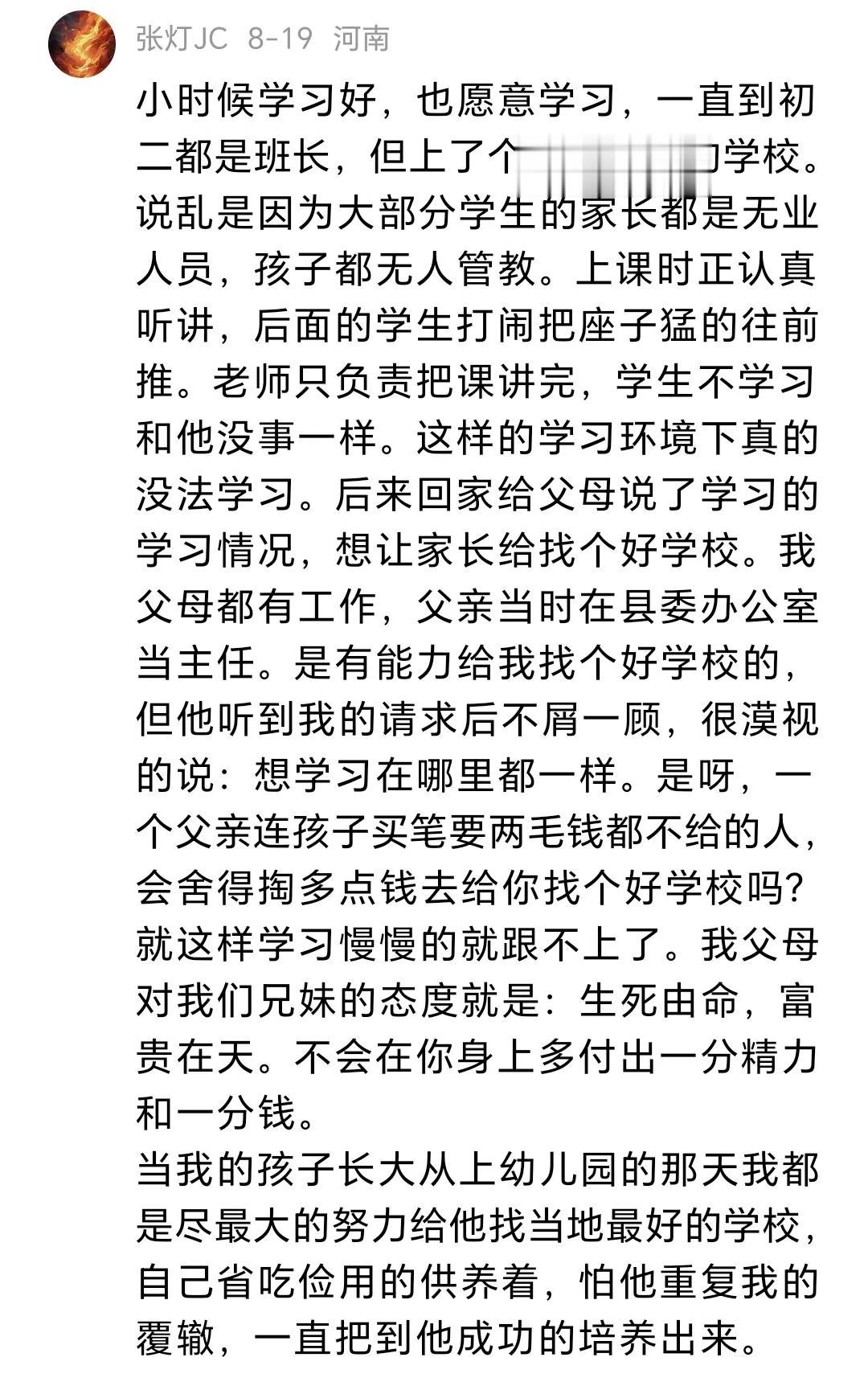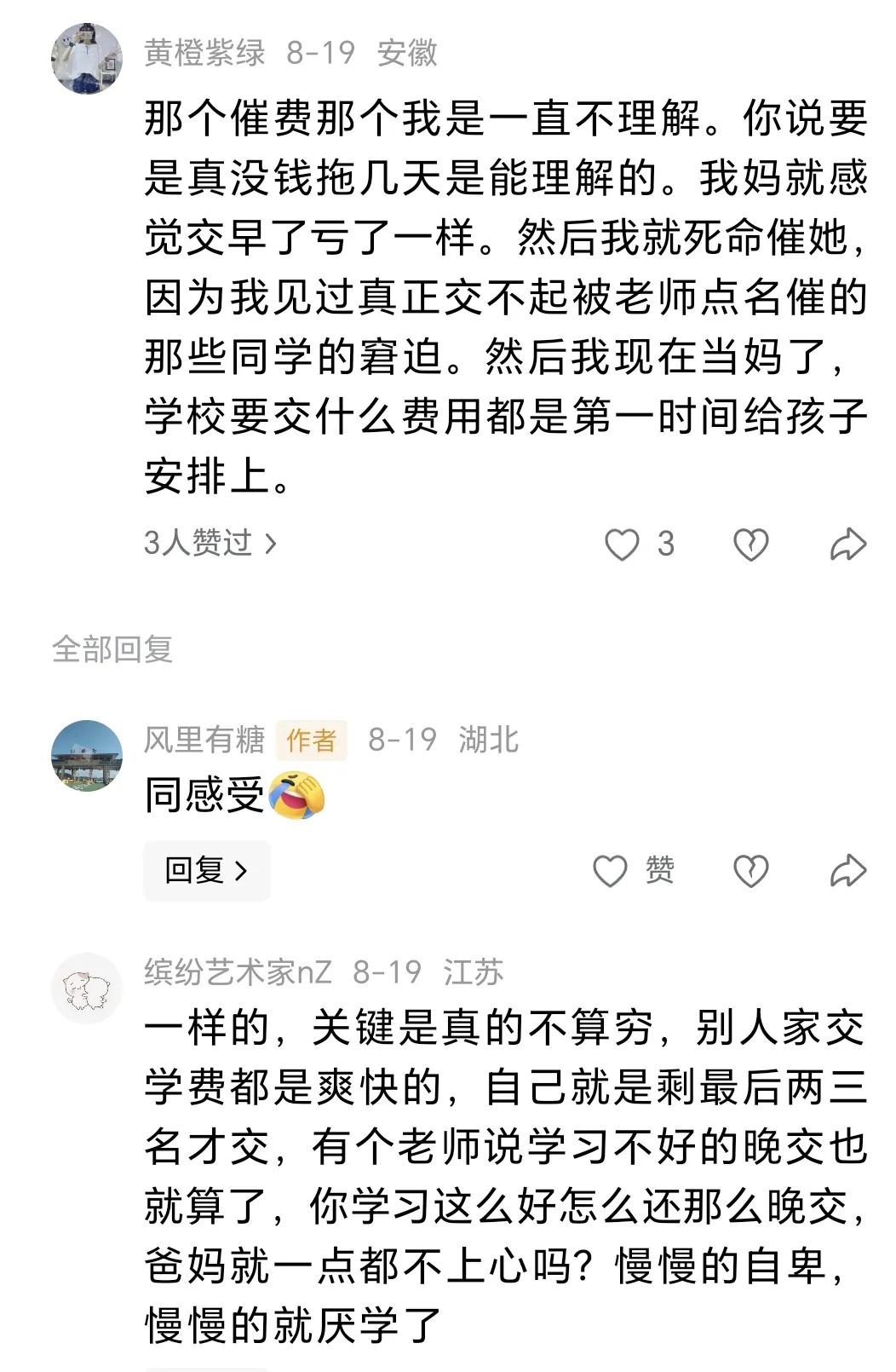 80后的我每次交学费的时候,被老师叫出去拍成一排肯定有我,即使最后剩个两三个甚至一个肯定还是我,平常的小小诉求更是被一一驳回,以致后来我无所求。虽然现在几十岁了,仍然无法释怀……因为我发现结婚以后,在我最困难的时候仍然是被拒绝……而其他的孩子则不会,真的有很好的家长,看看下面这个就是…