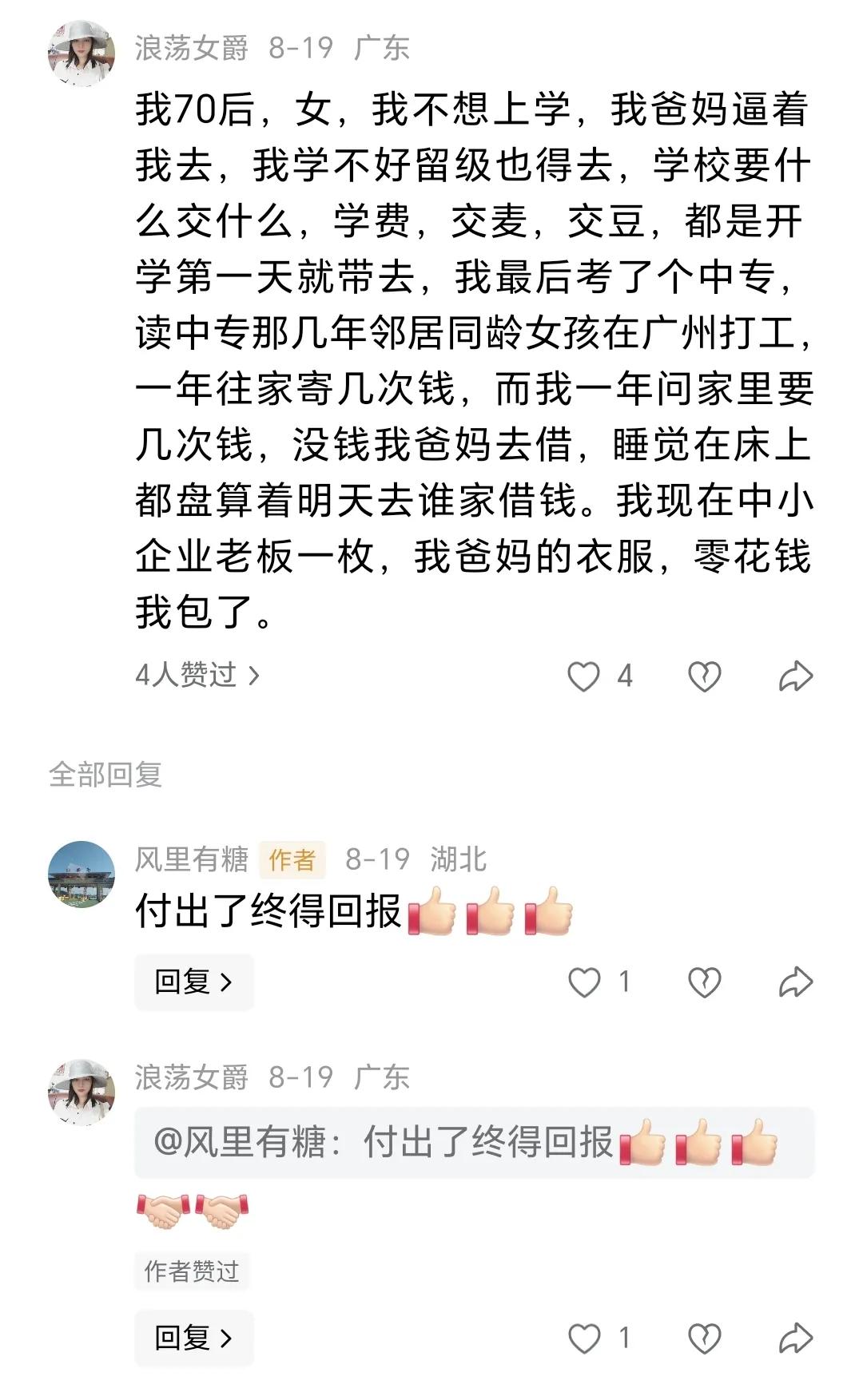 只是那份“不让去学习”的遗憾,大概会记很久吧——不是怪父母,而是心疼当年的自己,也心疼当年的父母:他们不是不想让你变好,是被眼前的生计压得只能先顾着“活下去”,没力气再去盼“更远的好”。这份懂与不懂交织在一起,才更像真实的生活啊。
