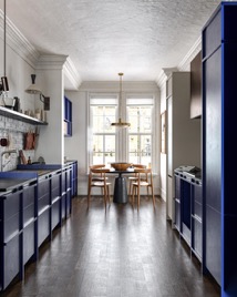 蓝色工业风厨房以丰富的材质、色彩、表面以及对比鲜明的家具巧妙融合,最终打造出一个和谐统一、细节之处引人瞩目的设计。