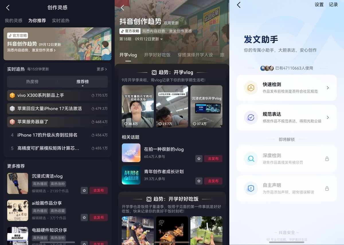 作品总违规?创作助手来把关,敏感词轻松规避;作品发布后,可以在数据中心查看视频的详细表现,各项数据一目了然;新手小白作品质量低没流量?学习中心和官方活动提供了不少实用的课程和流量机会,手把手教你拍爆款,而像上热门、流量奖励这类功能,则为创作提供了实实在在的激励。整体来说,这个版本把从找灵感、创作、发布到数据分析乃至收益的各个环节都整合在了一处,对咱们创作者来说,体验是更流畅集中了。