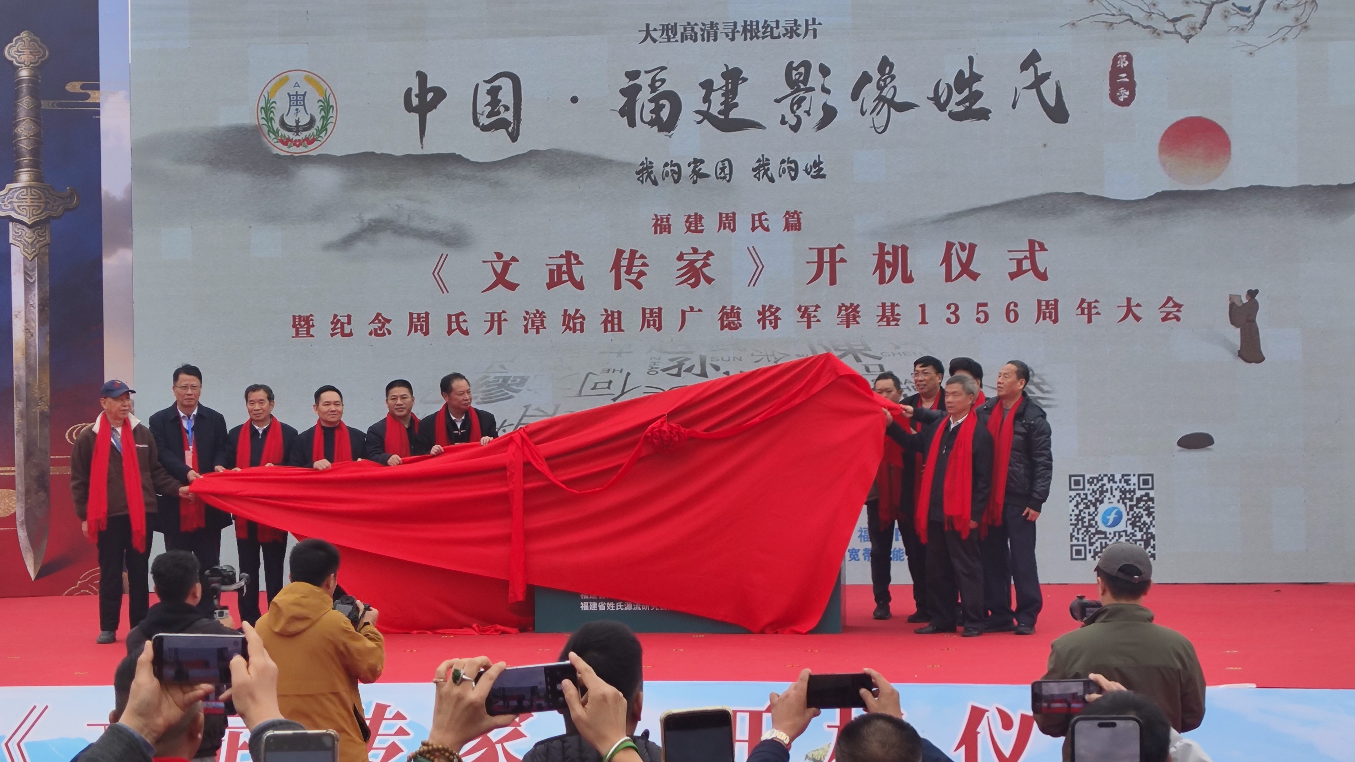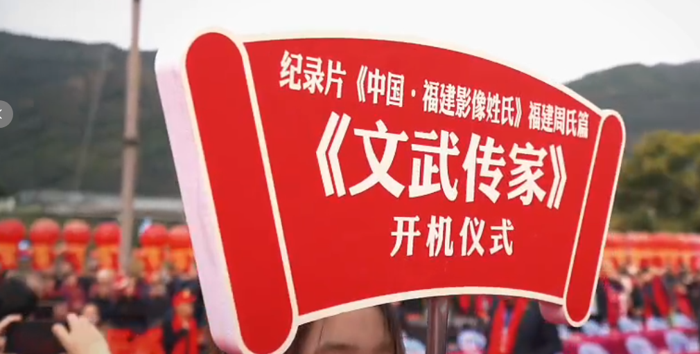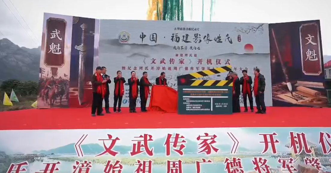 仪式现场,“纪念周氏开漳始祖周广德将军肇基1356周年”的醒目标志与“《文武传家》开机仪式”的背景板相互映衬,凸显活动主题。在众多宗亲与嘉宾的见证下,主办方举行了隆重的开机揭幕仪式,标志着这部旨在追溯福建周氏源流、展现家族“文韬武略、忠义传家”精神的纪录片正式启动拍摄。