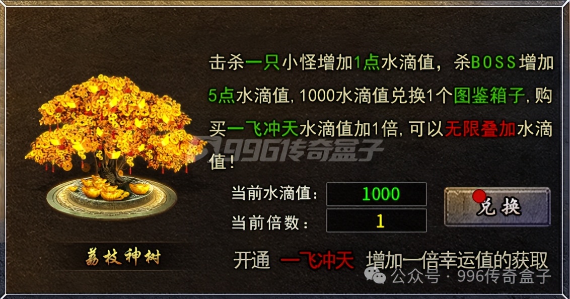 财源滚滚和荔枝树这两个玩法差不多,财源滚滚是加幸运值兑换金币,1幸运值兑换100金币。小怪加1点幸运值,BOSS加5点幸运值,满100点幸运值可以兑换。荔枝树则是用水滴值兑换图鉴箱子,1000水滴值兑换一个图鉴箱子。小怪加1点水滴值,BOSS加5点水滴值!这里要注意,财源滚滚的幸运值到一百就不会再往上累加了,要及时兑换,荔枝树的水滴值也是一样的。