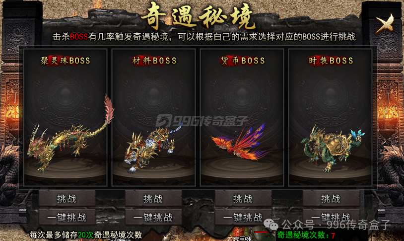 英雄崛起则是刷怪积攒杀戮值来抽奖,每抽奖一次可以获得十积分,消耗积分可以激活杀戮魔珠。魔珠等级越高,属性越强,进阶属性就越多!击杀BOSS有机率触发奇遇秘境,获得奇遇秘境次数后,可以根据自己的需求选择对应的BOSS挑战,每次最多储存20次奇遇秘境次数。不过前期可以攒一攒,因为这个BOSS还是很难打的。
