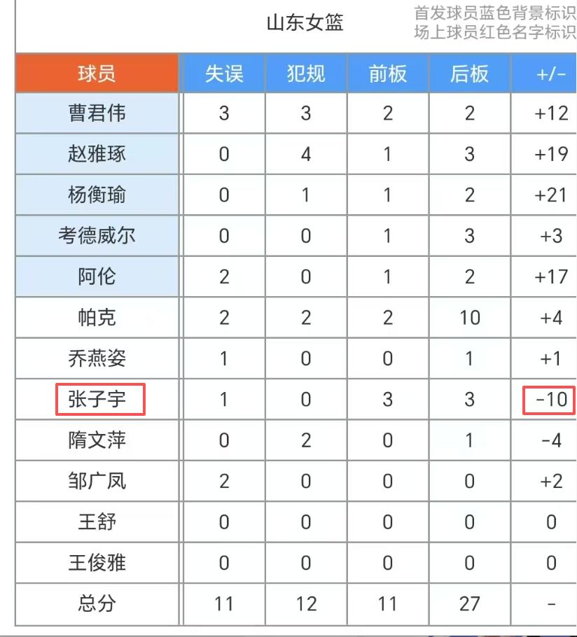 没错,她的命中率还是较高的,12分钟9投6中,拿到15分,但是她的正负值又是最低的,在场输10分。为什么她的命中率那么高,反而正负值最低?这就意味着她在场的时间,山东队多是选择两分,而河北女篮却是选择三分。如在第一节那段时间,山东队本来握有10分优势,可是张子宇替补上来后,分差渐渐缩小了,从领先10分,到此节结束时,只剩下了两分优势。虽然最终山东队赢了河北队,但是证明不了张子宇是不可或缺的队员,没有他山东队一样能拿下河北队。