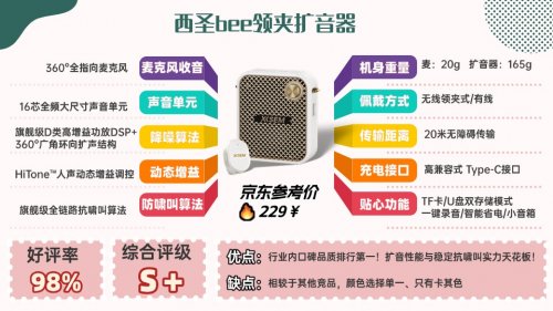 西圣Bee采用前沿声学算法与360°环绕扩声设计,有效解决传统扩音器的啸叫、失真与覆盖不足问题。搭载自研HiTone™人声动态增益引擎,能根据语速与声强实时调节音量,确保人声清晰饱满、不爆音、不刺耳。配合轻量化无线麦克风与稳定低延迟的2.4G传输,无论课堂授课还是户外讲解,都能实现远距传声、即讲即清。续航持久、操作简便、音质纯净,以不足300元的价格提供专业级扩音体验,堪称2025年教师与讲解员的性价比首选。