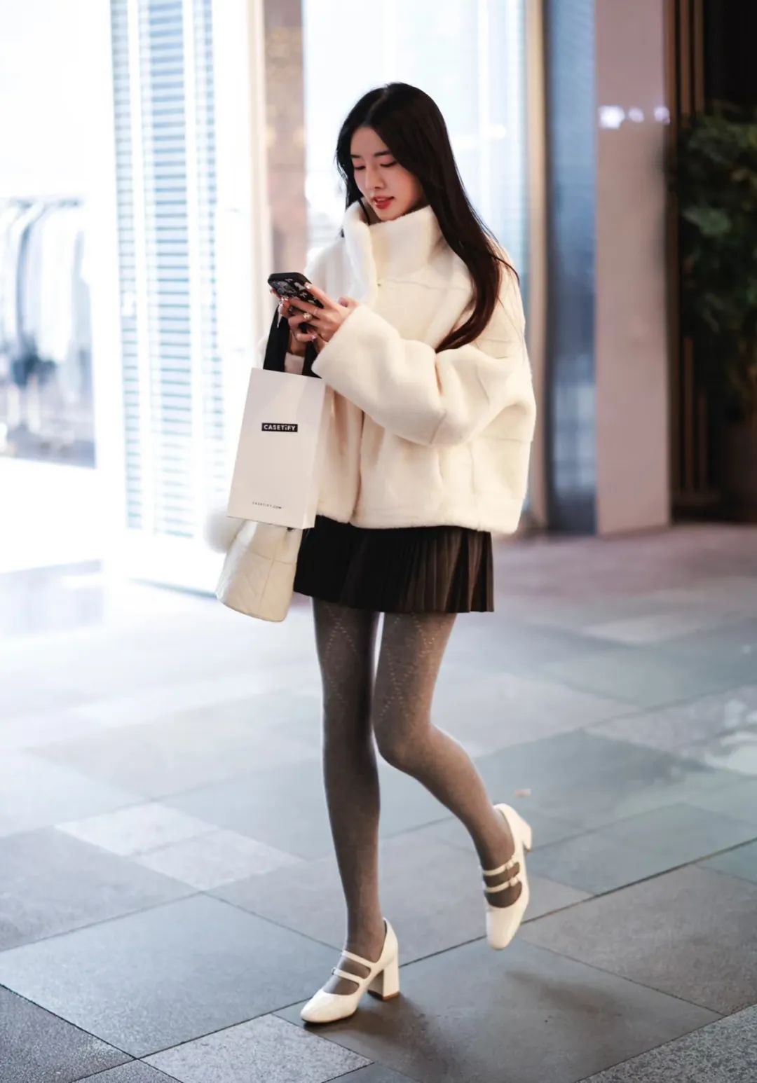 上半身的冬装选择棉服,迎合了当下的复古潮流趋势;下半身搭配超短裤配丝袜,融入夏季单品突出造型风格,拉伸腿部线条更显高。需要注意的是,丝袜尽量避免肉丝袜,容易显得俗气,尽量以黑丝为主,可以加入一些星星、爱心、线条等元素装饰,造型更时髦。② 皮草+半身裙,优雅显贵气