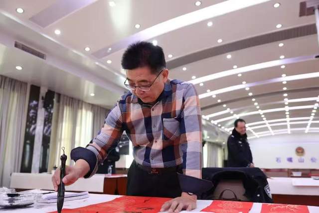 韦庆民,作为宁夏公安文联书法美术专业委员会的一员,多年来一直致力于书法艺术的创作与传播。在新春佳节来临之际,他积极参与宁夏公安文联开展的 “挥毫送祝福 泼墨暖警心” 迎新接福送春联活动。活动现场,他全神贯注,手中的毛笔犹如灵动的舞者,在红纸上翩翩起舞。或龙飞凤舞、潇洒飘逸,或刚劲峻拔、方润整齐,一幅幅散发着清新墨香的喜庆春联跃然于纸上 ,福字作品铺满了活动现场。他用手中的笔,将美好的期盼和祝愿融入每一个笔画之中,送到民警辅警手中。