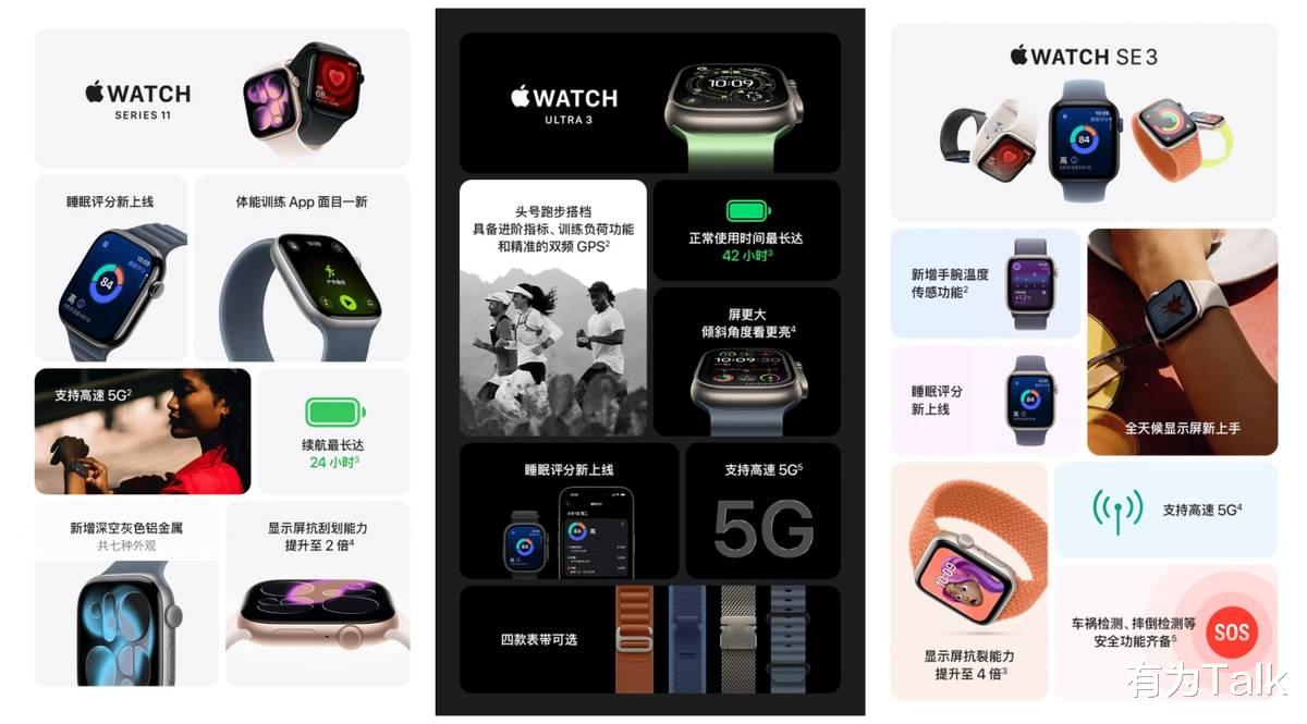 Apple Watch全系也值得说道,三款都支持5G是大亮点,Series 11的高血压趋势监测、睡眠评分很贴近健康需求(可惜国行暂不支持),Ultra 3的卫星通信+72小时续航,强化了户外属性,SE 3下放全天候显示屏、手腕温度传感,1999元的价格让更多人能接触到核心功能。