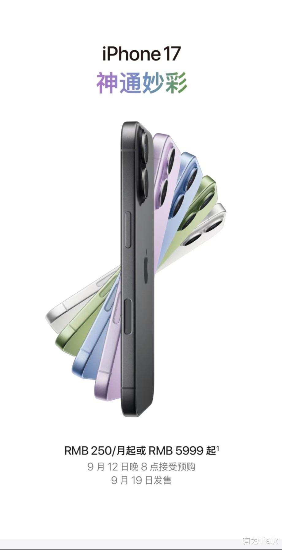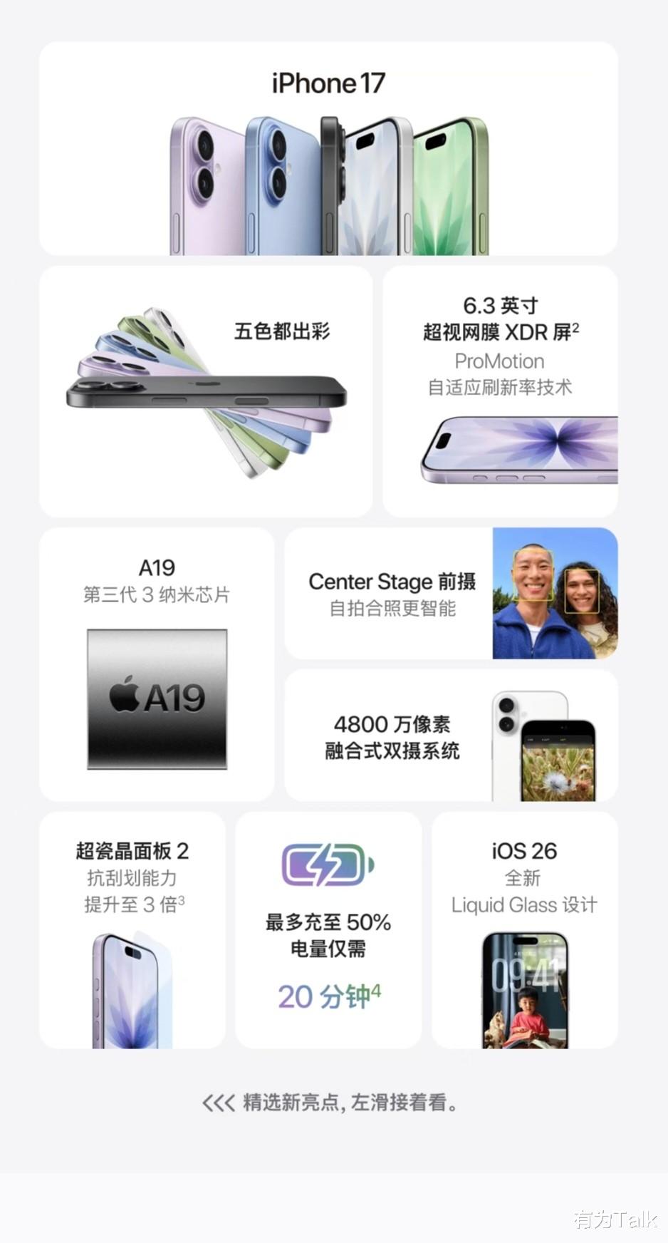 8款产品中备受关注的毫无疑问是iPhone阵营,iPhone 17标准版绝对是「情怀与实用双补」的惊喜款,等了四年的120Hz高刷终于配齐,而且还是带LTPO的1~120Hz可变刷新率,连抗反射玻璃、第二代超瓷晶面板这些Pro级配置都下放了,再加上4800万双摄、3nm 制程工艺的A19处理器、256GB起步容量,价格却死死钉在5999元,这机型大概率会成近五年销量黑马,毕竟谁能拒绝「加量不加价」的基础款呢?