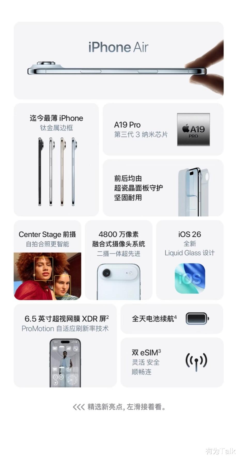 目光移到iPhone Air上,这款产品更像是苹果探索轻薄的试水作品,5.6mm厚度,纯钛合金边框的设计,把「轻薄」做到了新高度,更关键的是它没为了薄而牺牲太多性能,A19 Pro处理器、N1无线芯片、C1X低耗基带,性能接近Pro系列,国行首款纯eSIM的身份更是打破了行业惯例,虽然3000mAh出头的电池有点遗憾,但配套的超薄MagSafe充电宝也算补了短板。