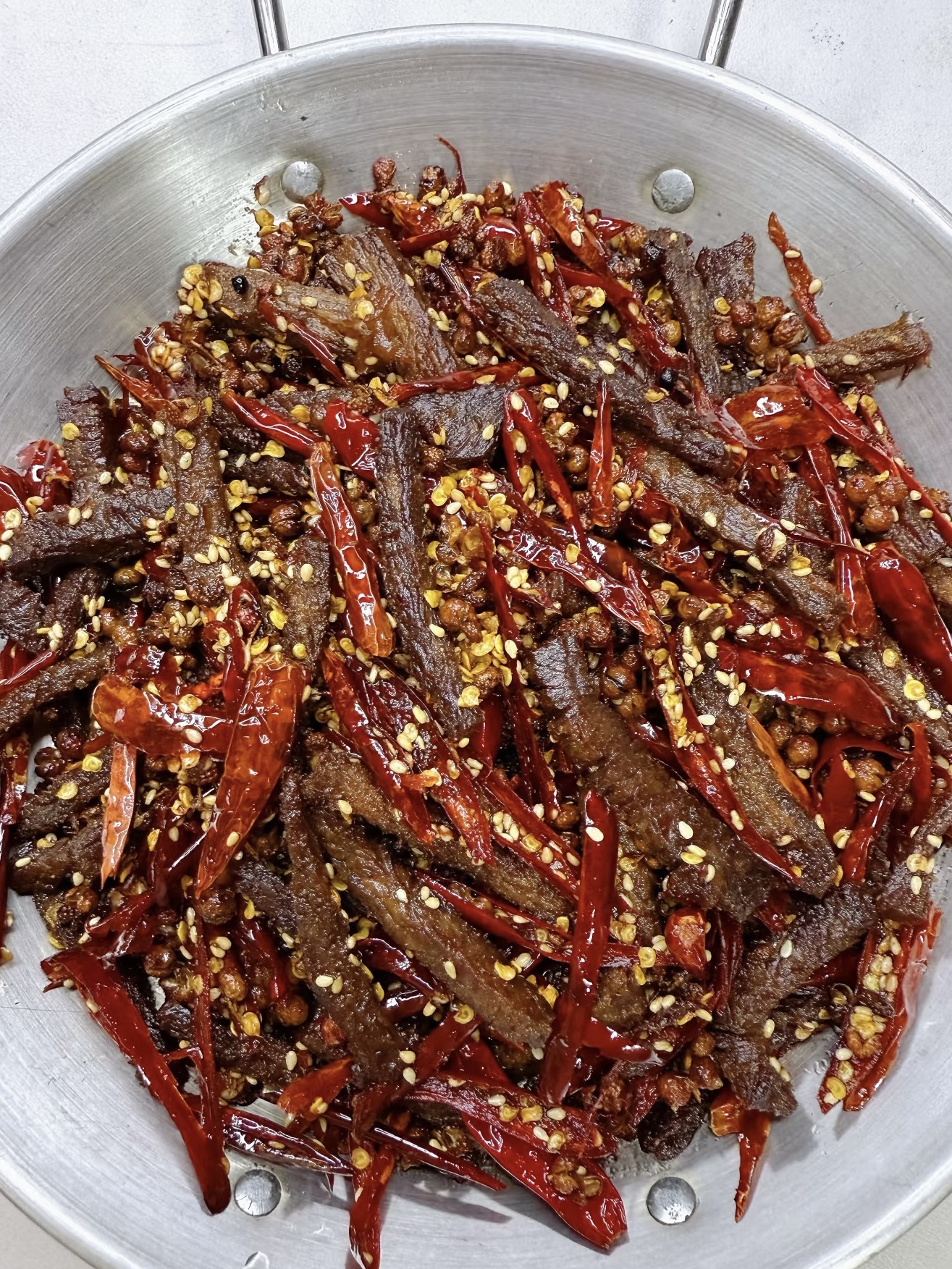 炒好的牛肉条盛出备用。接着,我们开始炒制香料。锅中留底油,放入泡好的花椒和干红辣椒丝,用小火慢慢炒香。这一步需要耐心,火太大容易炒糊。