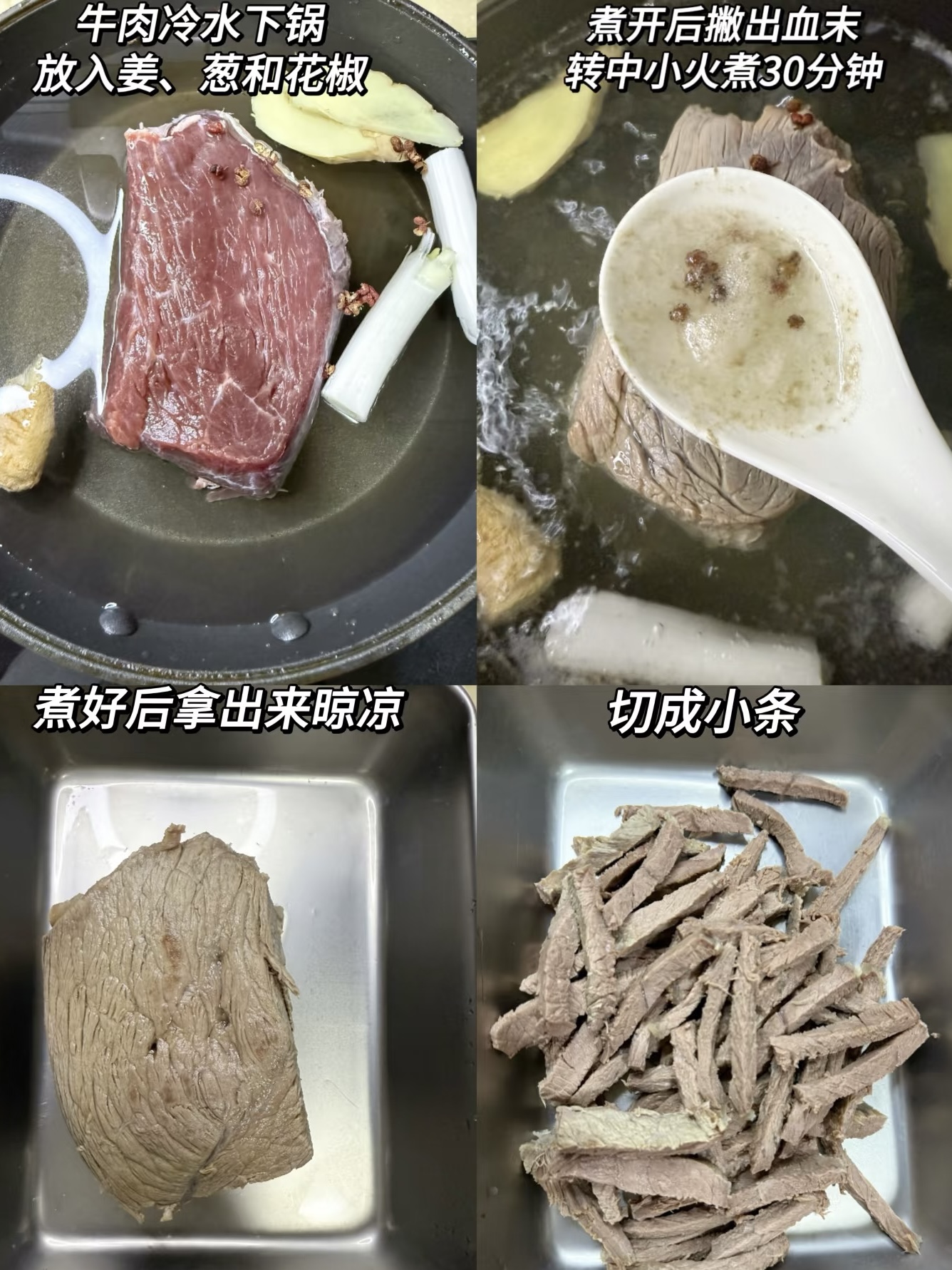煮好的牛肉捞出来,放在一边晾凉。这一步很重要,因为只有牛肉完全冷却后,才能切成均匀的小条。切牛肉的时候,要逆着纹路切,这样切出来的牛肉条才会更加嫩滑。