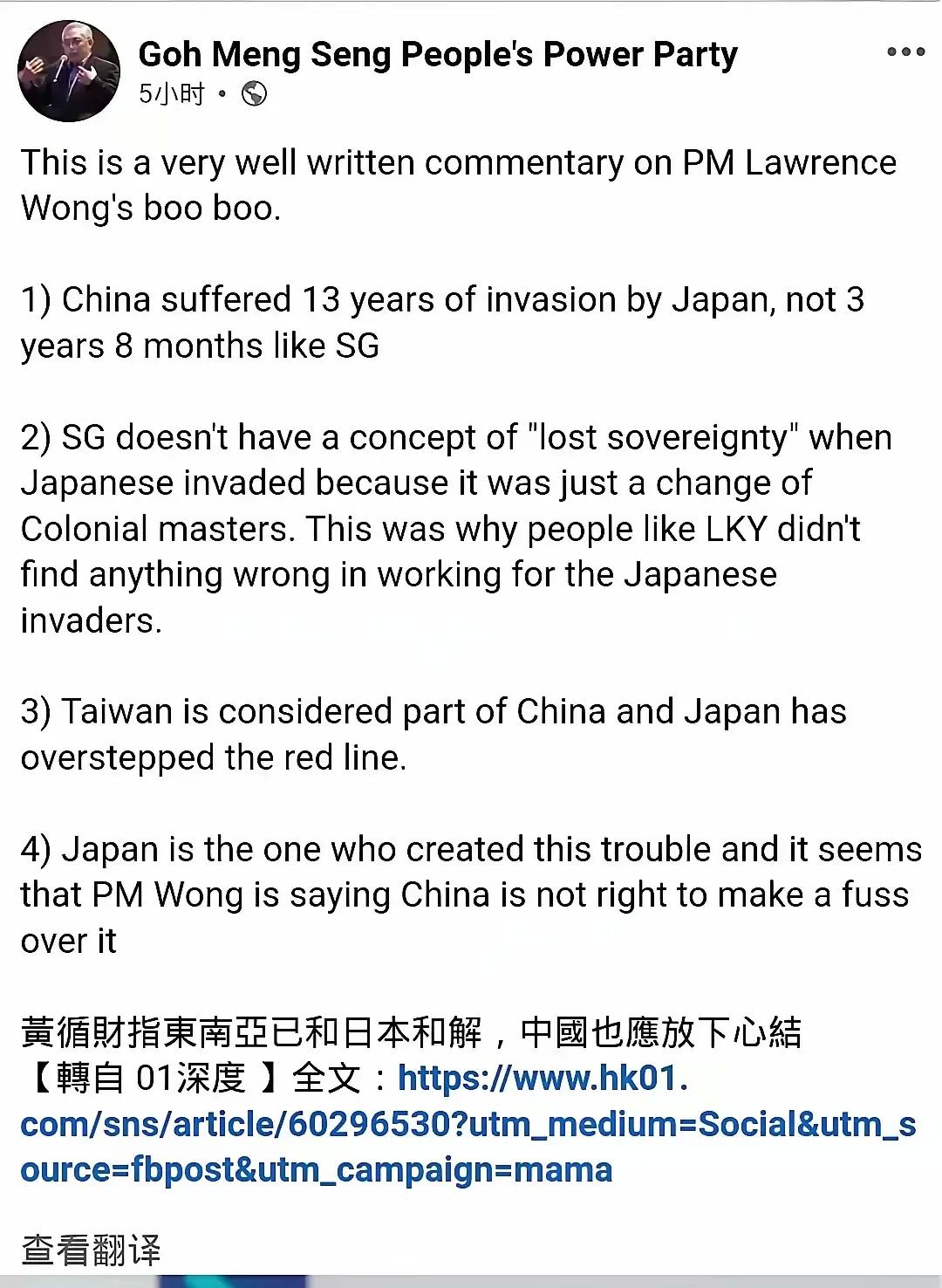 事情是这样的,一开始是日本那个高市早苗说了些不该说的话,引起争议,然后黄循财就出来说话了,他说中国应该放下历史包袱,这下可好,中国这边不乐意了,批评声一片。